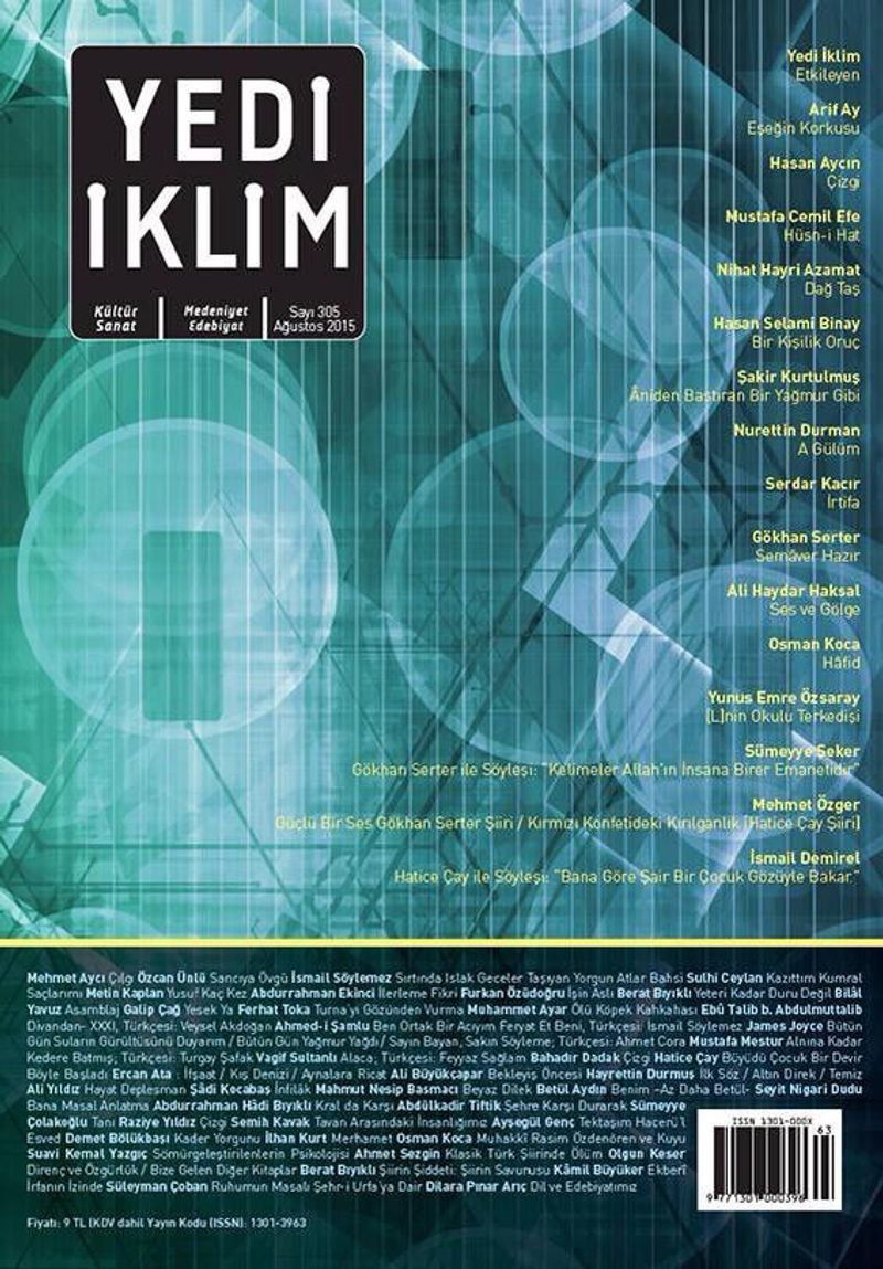 Yedi İklim ağustos sıcaklığında mavi bir serinlikle selamlıyor okuyucularını.305.sayı zengin içeriği ve içtenliğiyle sanat ve edebiyat dünyasının nabzını tutmaya devam ediyor.