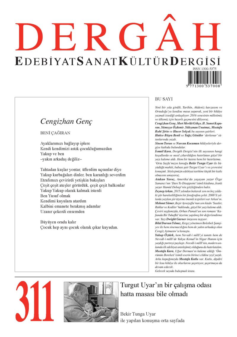 Dergâh’ın 311. sayısında genç şairler dikkat çekiyor. Ocak sayısında dergide şiiri yayınlanan şairler: Cengizhan Genç, Mert Mevlüt Gökçe, H. Samet Koparan, Sümeyye Özdemir, Süleyman Unutmaz, Mustafa Ruhi Şirin ve Hacer Selçuk.