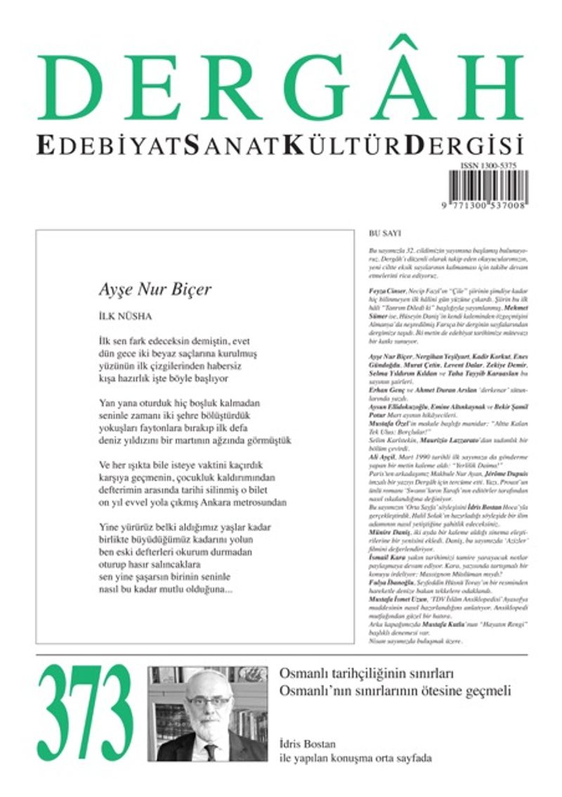 Bu sayımızla 32. cildimizin yayımına başlamış bulunuyoruz. Dergâh’ı düzenli olarak takip eden okuyucularımızın, yeni ciltte eksik sayılarının kalmaması için takibe devam etmelerini rica ediyoruz.