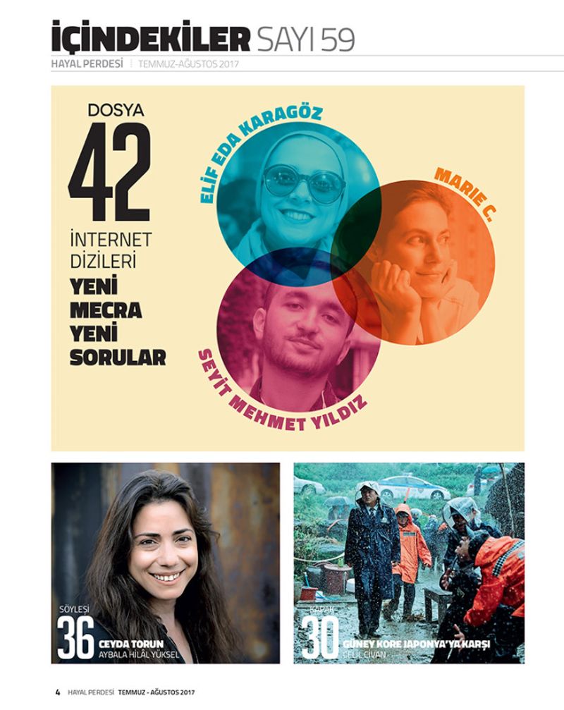 Dosya bölümünde gitgide daha çok ilgi gören internet dizileri üzerine düşündük. Online dizi kanallarının açıldığı, Onur Ünlü, Kutluğ Ataman gibi yönetmenlerin de online kanallara rağbet gösterdiği bu dönemde internet dizileriyle dikkat çeken Elif Eda Karagöz, Seyit Mehmet Yıldız ve Marie C.’ye projelerini, internetin getirdiği imkânları ve değişen seyirci profilini sorduk. Yeni bir mecra olarak yönetmenlere heyecan veren internete dair soruşturmamızı gelecek sayılarda devam ettirmek istiyoruz.