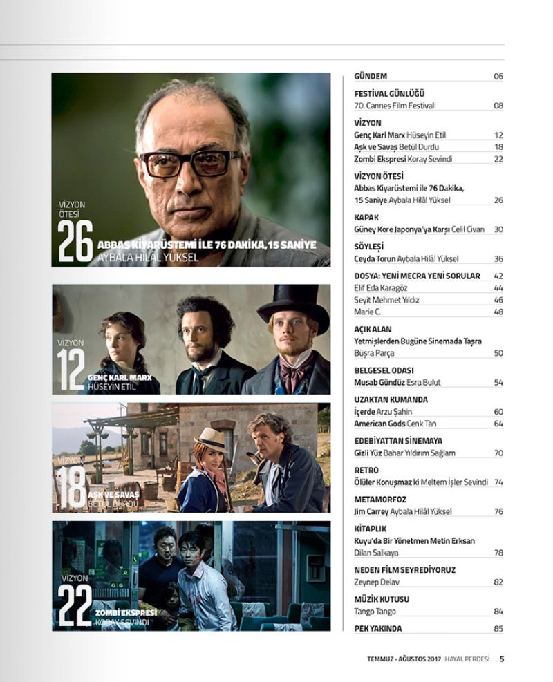 Derginin Vizyon sayfalarında Genç Karl Marx, Aşk ve Savaş, Zombi Ekspresi ve Vizyon Ötesi bölümünde Abbas Kiyarüstemi ile 76 Dakika, 15 Saniye filmlerini değerlendirdik.