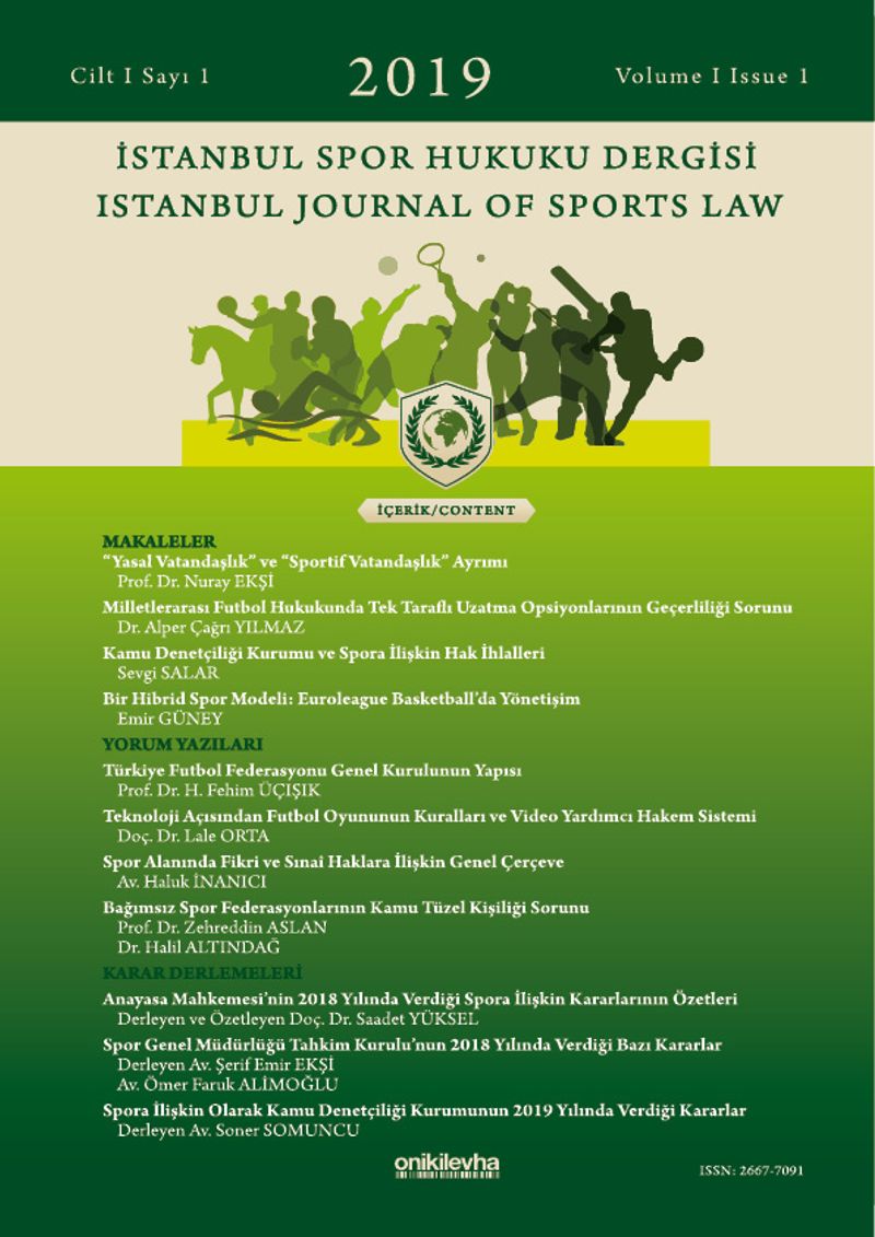 The articles published in 2019 Issue 1 of the Istanbul Journal of Sports Law that will be published for the first time in the field of sports law in Turkey address the differences between sporting nationality and legal nationality; the validity problem of unilateral extension options in the international football law; Ombudsman Institution and violation of sport related rights; an hybrid sports model governance at Euroleague Basketball. This Issue also features an evaluation of general framework of intellectual and industrial property rights in field of sports; the rules of the football game in respect of technology and video assistant referee system, and the structure of the General Assembly of the Turkish Football Federation. We have, in this Issue, also summaries of the Constitutional Court decisions made in 2018, decisions of Ombudsman Institution made in 2019 as well as compilation of the full texts of the selected decisions of the General Directorate of Sports Arbitration Board made in 2018.