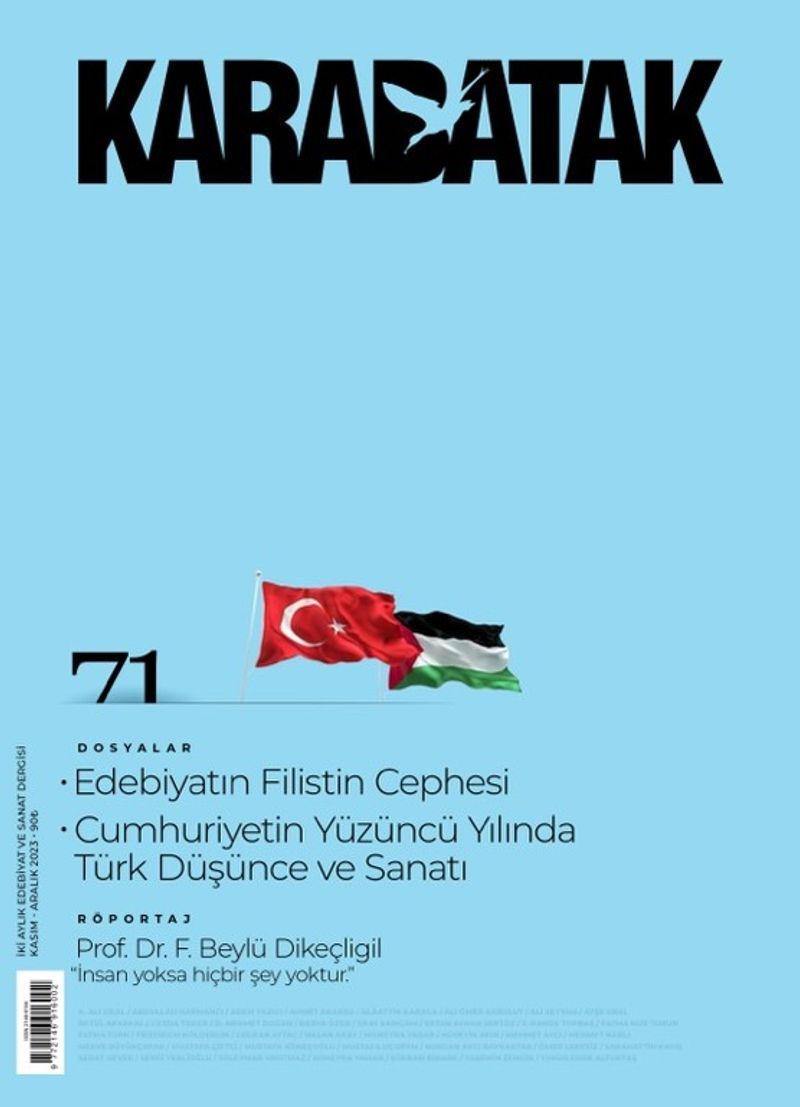 Karabatak bu sayısında da Cumhuriyetin yüz yıllık sürecinde sanat, edebiyat, düşünce gibi disiplinlerin incelenmesine devam ediyor. Geçtiğimiz sayıda dil, deneme, şiir, öykü ve roman olarak ele aldığımız dallara bu sayımızda fotoğraf, mimari, grafik tasarım, resim, psikoloji, hat sanatı, sosyoloji, felsefe, müzik ve sinemayı ekliyoruz. Hepsi birbirinden kıymetli akademisyen ve yazarlar tarafından kaleme alınmış olan bu yazılarla Cumhuriyetin Yüzüncü Yılı’nda bu alanlardaki durumu, gelişmeyi, köklerle bağını, yapılanları ve yapılması gerekenleri ortaya koyduğumuzu ve sürecin açık bir fotoğrafının okur gözünde canlanabileceğini umut ediyoruz.