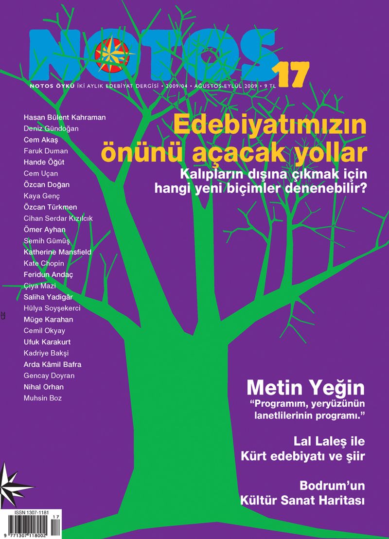 İki aylık edebiyat dergisi Notos’un Ağustos’ta yayımlanan 17. sayısının kapak konusu, Edebiyatımızın önünü açacak yollar başlığını taşıyor. “Kalıpların dışına çıkmak için hangi yeni biçimler denenebilir?” sorusu çevresinde, bugüne dek gündeme getirilmemiş bir yazınsal sorunu ele alan Notos, edebiyatımızın yakın geleceğine ışık tutacak yazınsal arayışları, biçimleri, deneysel edebiyatın sınırlarını tartışıyor. Hasan Bülent Kahraman, Deniz Gündoğan, Cem Akaş, Faruk Duman, Hande Öğüt, Cem Uçan, Özcan Doğan, Kaya Genç, Özcan Türkmen, Cihan Serdar Kızılcık, Ömer Ayhan, Semih Gümüş’ün yazılarıyla.
