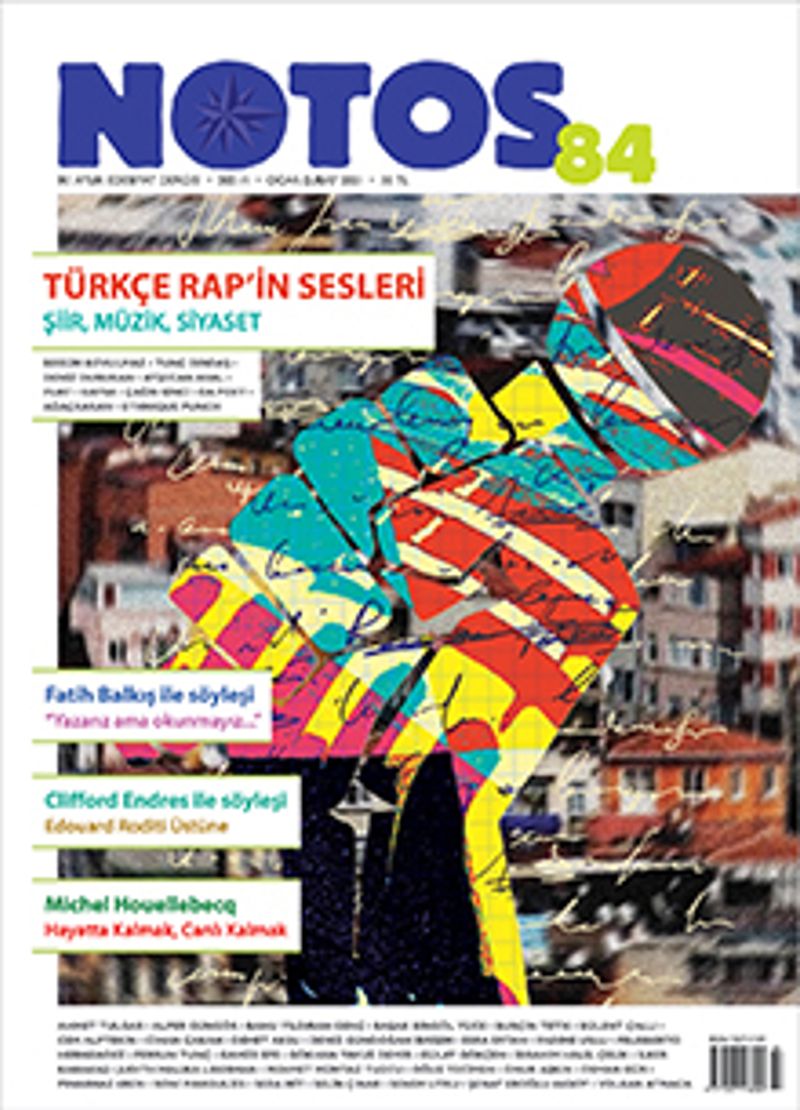 Notos Ocak-Şubat, 84. sayısında Türkçe Rap’e yöneliyor. Sözlü kültür, müzik, edebiyat arasındaki etkileşimin son yirmi yıldaki en önemli verimi, Almanya ve ABD’deki hip hop ve rap kültürüyle köklenip gelişen ve kendine has bir müzik kültürü oluşturan Türkçe Rap oldu. Türkçe Rap’i şiirle bağları, müzikal özellikleri, söylem biçimleri, tarihi ve siyaseti üzerinden ele alan bu dosyada Begüm Kovulmaz, Tunç “Turbo” Dindaş, Deniz Durukan ve Ayşecan Aral’ın yazıları, Selin Çınar, Onur Aşkın, Turbo ve Seda Mit’in illüstrasyonları yer alıyor. Fuat, Çağrı Sinci, Kayra, Ağaçkakan, Da Poet ve Ethnique Punch “Şiirden Liriğe, Ozandan MC’ye: Türkçe Rap’in Sesleri” soruşturmasına yanıtlarıyla katkıda bulunuyor.