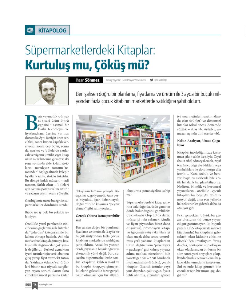 Tanıtım sayımızı yayımladıktan sonra müthiş bir heyecan oluştu. Biz de hemen kolları sıvadık ve 1. sayımızla huzurlarınızdayız. Kitap dergisi OKUR’un bu sayısının kapak dosyası “Çok mu Satıyorlar?” başlığıyla hazırlandı. Çok sattığını zannettiğimiz bestseller listeleri ticari kaygılarla ve kandırmacalarla mı hazırlanıyor? Çok satanları tesbit etmek çok mu kolay? Ya gerçekten ‘çok satması’ istenilen kitaplar öne çıkıyorsa?