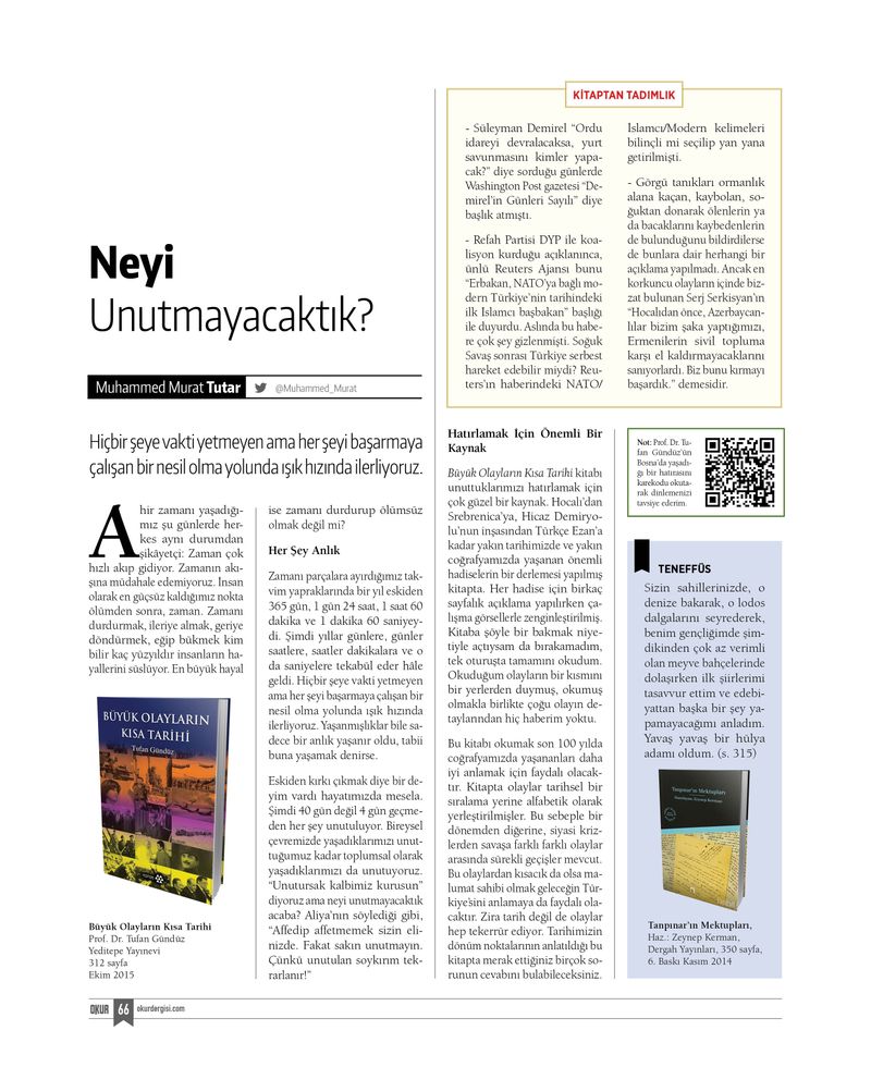 Usta öykücümüz Rasim Özdenören, Nazif Gürdoğan ve Ahmet Kekeç’in kitaplarını yazdı. M. Lütfi Arslan “Okudum Bildim Deme” diyerek her okumanın doğru okuma olmadığının altını çizdi. Suavi Kemal Yazgıç “Yanlış İsimli Kitaplar” köşesinde “kayıp” kitapların peşine düştü. Ahmet Sadrettin babasıyla okuduğu kitapları anlattı. Yusuf Turan Günaydın “keşke çevrilse” köşesinde Hz. Peygamber ile ilgili Fransızca yazılmış bir kitabın Türkçe’deki izini sürdü. Süleyman Ragıp Yazıcılar günlük tadındaki sayfasında başka başka yerlere götürdü bizi.