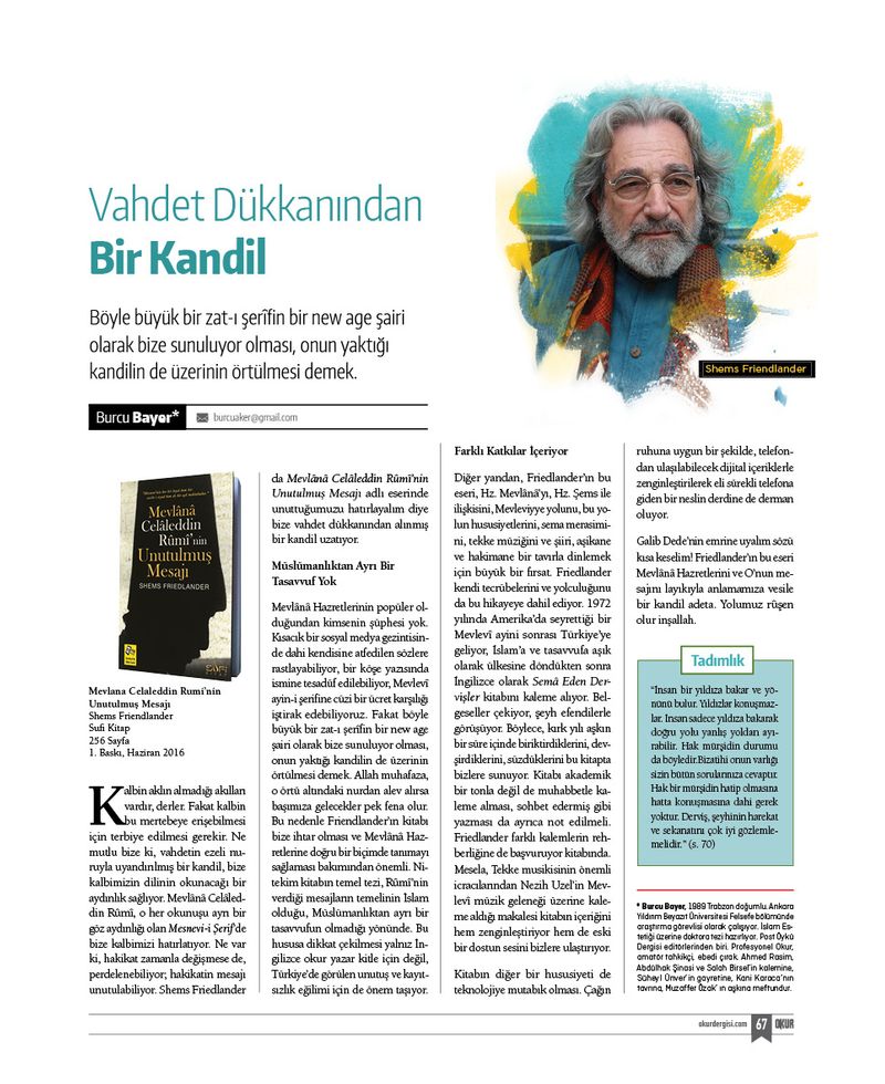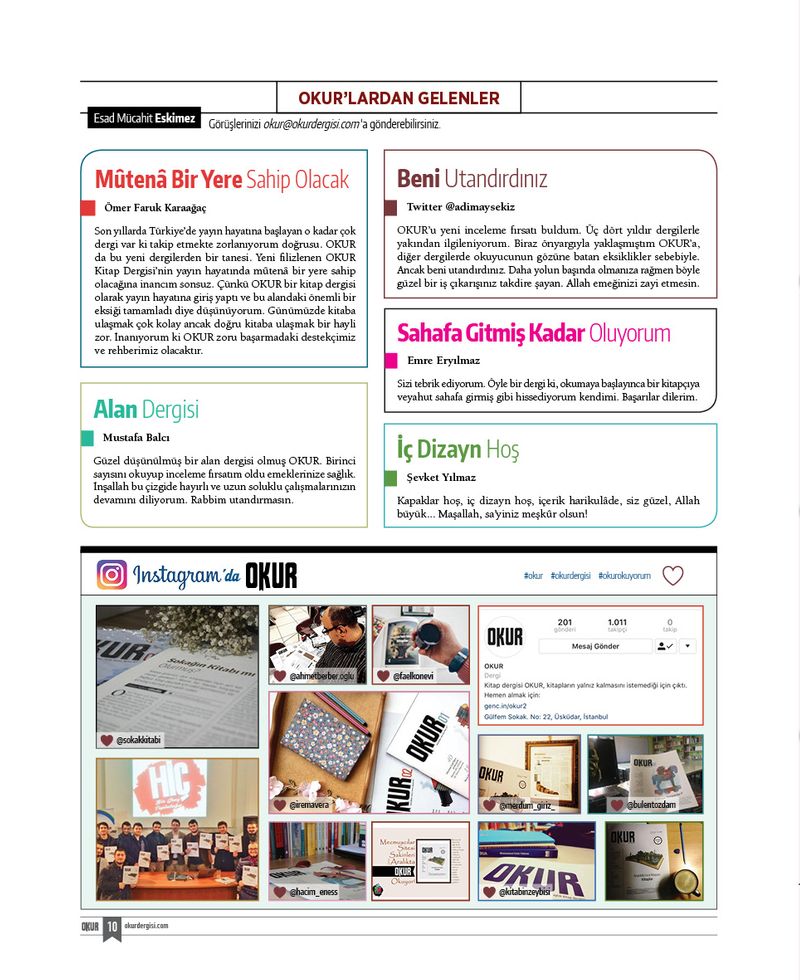 Okur’un 3. sayısını sizlere sunmanın mutluluğu içerisindeyiz. Geri dönüşlerden anlıyoruz ki Okur, şimdiden kültürel hayatımızda önemli bir boşluğu doldurdu ve yerini sağlamlaştırdı. Katkı sağlayan herkese ayrı ayrı şükran borçluyuz.