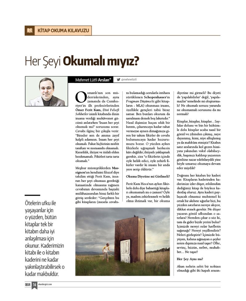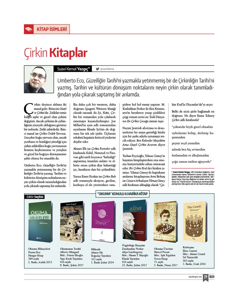 M. Fatih Andı klasikleri sorgulayan çok özel bir yazı yazdı. M. Lütfi Arslan “Her Kitabı Okumalı mıyız?” diye sordu. Suavi Kemal Yazgıç yine kitap isimlerinden yola çıkarak “Çirkin Kitaplar”ı kaleme aldı. Metin Karabaşoğlu editörlük dersleri verdiği serisine bir güzel yazı daha ekledi. Ayşegül Genç, İbrahim Demirci, Turan Karataş, Turgay Bakırtaş, Süleyman Ragıp Yazıcılar, Rabia Gülcan Kardaş, Ayşenur Narboğa, Yusuf Turan Günaydın ve ismini buraya sığdıramayacağımız yazarlarımız farklı pencerelerden kitapların büyülü dünyalarını aralamaya çalıştılar.