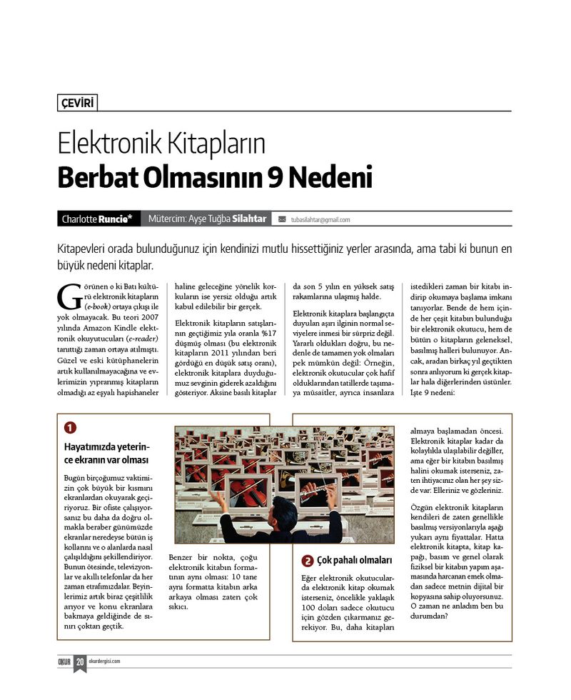 Orta sayfa söyleşimizi Mustafa Özel ile yaptık. Kağıt para, ulus ve romanın nasıl aynı cümlenin içinde sıralandığını merak ediyorsanız bu sayfaların tamamını okumalısınız. Abdullah Harmancı ile "ne okur" köşesi için yaptığmız görüşmeyi, Kasım Küçükalp ile okuma üzerine yaptığmız sohbeti, bir bürokratın kitaplarla kurduğu ilişkiyi merak ettiğimiz Refik Tuzcuoğlu söyleşisini, Serap Ekizler Sönmez ile mimari üzerine yaptığımız konuşmayı ve seyahat okurlarının çok beğeneceğini düşündüğümüz Kaçak Yolcu isimli yeni kitabı vesilesiyle Adem Özköse ile buluşmamızı da dikkatlerinize sunmak isteriz. Ayrıca Beyoğlu’nun en eski sahaflarından Emin Nedret İşli ile yaptığımız söyleşiyi de atlamamanızı öneririz.