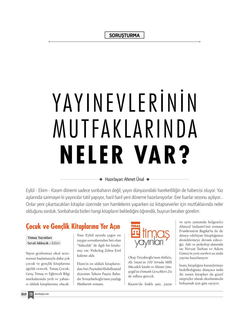 Tüm bunların dışında yayıncılık dünyasından kitap haberleri, onlarca tahlil ve inceleme metni; hatırat, seyahat, psikoloji, tarih, çocuk kitaplıkları ve köşeler de sizleri bekliyor. Hasılı, yine zengin bir içerik sunmaya gayret ettik.