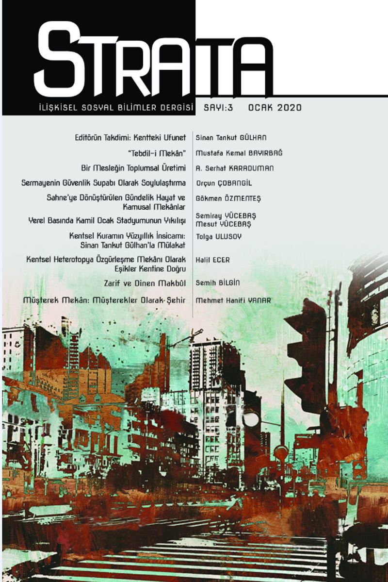 Kent, bir yanıyla ufunet, diğer yanıyla bir hayalet mekânını teşkil etmekte. Kentteki ufunet, bugün artık Büyük Resesyon adını verdiğimiz toplumsal süreçlerin etkisiyle 2008’de bütün aceleci çıplaklığıyla dünya çapında sermaye birikimi süreçlerinde kendini gösterdi. Ancak, şehir, sosyal bilimlerin bastırılmış bilincinin doğduğu yer olmaktan da vazgeçmedi. Kentin ve şehirciliğin kendisinden kaynaklanmayan, kentsel mekânı üreten ekonomi-politik süreçlerin sonucu olan ufunet, çürümenin kokusu, sosyal bilimcileri yeni kapılar açma arayışına itti. Zaman-mekânsal sıkışma çağının yaygın kültürel, siyasi ve toplumsal etkileri, Küresel Kuzey’in son birikim krizinden itibaren hem Küresel Kuzey hem de Küresel Güney içinde ciddi kırılmalara sebep oldu. Türkiye’nin, ülkenin büyükşehirlerinde yığılmış konut stoku, toprağa gömülen artı-değerin yeniden yeşereceğine duyulan güven, kent hayatının hızla AVM’ler ve özelleştirilmiş mekânlarca zapt edilmesi, tüketimin ve rant arayışının şehri prangalara vurması gibi olgular ışığında tanımaya başladığı bu çürüme ve kriz döngüsü, yeni ve farklı sınıfsal kimliklerde kendini göstermekte. Ülkemizde, son yirmi yılda gitgide zenginleşen kentleşme ve şehircilik lügatine mütevazı bir katkı sunmayı hedefleyen Strata’nın elinizde tuttuğunuz üçüncü sayısı, kentteki ufunetin toplumsal olgulara yön verme biçimlerine Henri Lefebvre’in kuramsal katkıları ekseninde bir yaklaşım getirme kaygısıyla okuyucusuyla buluşuyor.