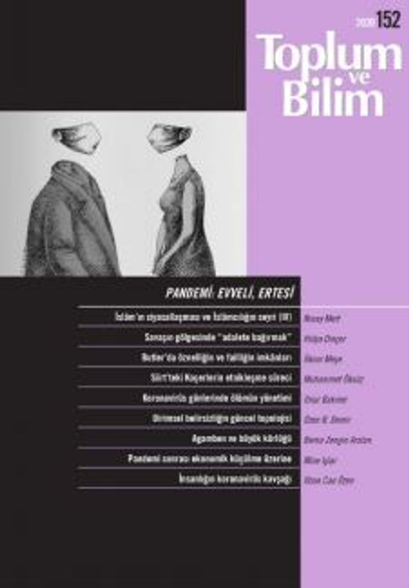 Bu sayıda... Nuray Mert İslâm’ın siyasallaşması ve İslâmcılığın seyri (IV): İki dünya savaşı arasında İslâmcılık Hülya Dinçer 90’lardan bugüne Türkiye’de cezasızlık politikalarının bilançosu: Savaşın gölgesinde “adalete bağırmak” İlknur Meşe Butler’in toplumsal cinsiyet performatifliği kuramında öznelliğin ve failliğin imkânları Muhammet Öksüz Bilimsel körlükten zorla yerinden etmeye: Siirt’teki Koçerlerin etnikleşme süreci DEĞİNİ Onur Bakıner Koronavirüs günlerinde ölümün yönetimi Özen B. Demir Viral salgın: Dirimsel belirsizliğin güncel topolojisi Berna Zengin Arslan Salgının icadı olur mu? Agamben ve büyük körlüğü Mine Işlar Pandemi sonrası dönüştürücü potansiyel: Ekonomik küçülme üzerine İlhan Can Özen Çözüm mü, çözülme mi? İnsanlığın koronavirüs kavşağı ABSTRACTS (İngilizce özetler)
