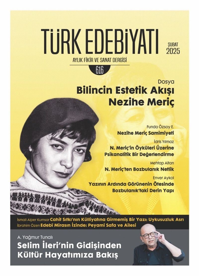 Dergimizin bu ayki dosya konusu Türk edebiyatının zarif kalemlerinden biri olan Nezihe Meriç. Eserlerinde hayatın kıyıda kalan detaylarına dikkat çeken ve insan ruhunun amansız bulanıklığını bir kadın duyarlılığı ile resmeden Meriç’e dair dosyamızın ilk yazısı Funda Özsoy E.’ye ait. Özsoy E., Meriç’in kadınların toplumdaki rollerine dair farkındalıklarını sade bir üslupla işlediğini ve Türk edebiyatında bilinç akışı tekniğini başarıyla uygulayan öncü isimlerden biri olduğunu dile getiriyor.  İdris Yılmaz, Nezihe Meriç’in öykülerini psikanalitik bir yaklaşımla değerlendirerek bu öykülerde bilinç dışı unsurlar, rüyalar, yalnızlık, yabancılaşma ve bireylerin iç çatışmaları gibi temaların ön plana çıktığını vurguluyor. Ayrıca karakterlerin davranışlarını şekillendiren bilinç dışı etkilerin öykülerde incelikle işlendiğini aktarıyor. Mehtap Altan, Nezihe Meriç’in Türk edebiyatı için neden önemli bir kalem olduğuna değiniyor. Enver Aykol ise Nezihe Meriç’in Bozbulanık adlı eserinin derin yapısını tahlil ederek yazarın bilinç akışı tekniğini, kitaptaki metaforları ve sembolleri analiz ediyor.