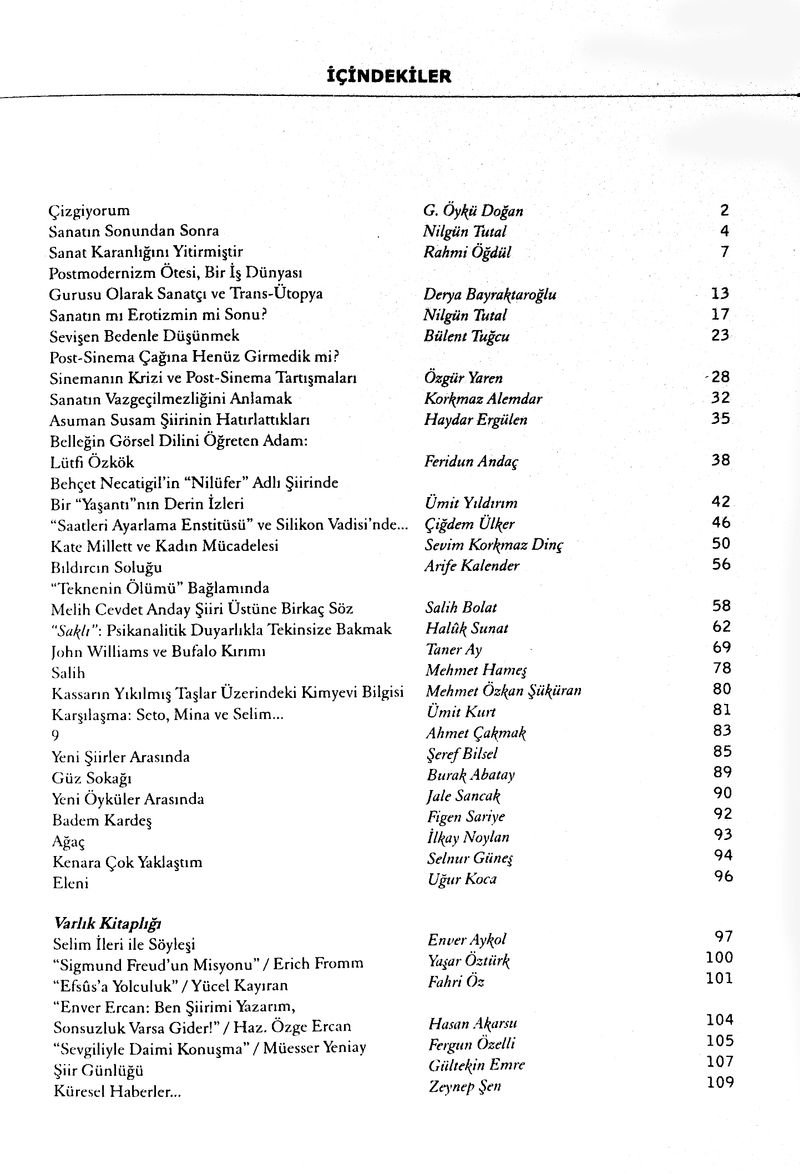 Varlık Kitaplığı: Selim İleri ile Söyleşi (Enver Aykol) − Sigmund Freud’un Misyonu / Erich Fromm (Yaşar Öztürk) − Efsus’a Yolculuk / Yücel Kayıran (Fahri Öz) − Enver Ercan: Ben Şiirimi Yazarım Sonsuzluk Varsa Gider / Özge Ercan (Hasan Akarsu) − Sevgiliyle Daimi Konuşma / Müesser Yeniay (Fergun Özelli) − Şiir Günlüğü (Gültekin Emre) − Küresel Haberler (Zeynep Şen)