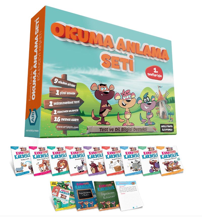 Akıcı okumayı sağlayan 16 okuma kartı9 özgün hikaye, okumayı sevdiren 1 çizgi roman1 değerlendirme testi ve öğretmenlerimize kullanım kolaylığı sağlayan, hikaye özetlerinin ve etkinlik çözümlerinin yer aldığı öğretmen kılavuzundan oluşmaktadır.