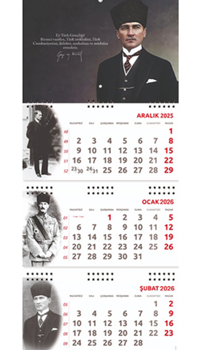 3 Parça Spiralli 2026 Atatürk Gemici Duvar Takvimi • Ürün Ebadı: 27,5x65 cm • Blok Ebadı: 27,5x13,5 cm • Üst Karton Ebadı: 27,5x20 cm • Yapraklar: 80 g 1. Hamur • Alt Karton: 350 g Bristol • Göstergeli