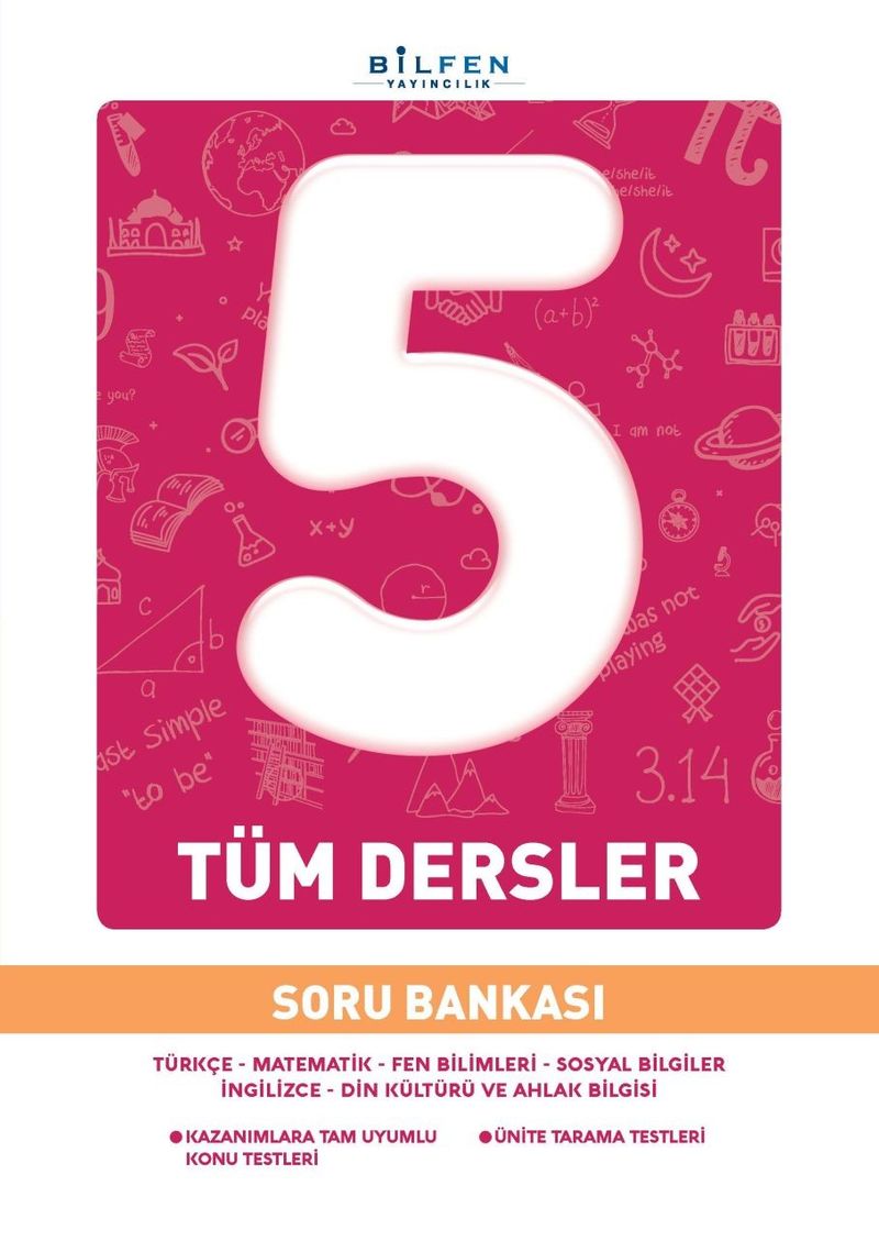 Tüm Dersler Soru Bankaları, eğitim ve öğretimde başarısını kanıtlamış "Bilfen Eğitim Kurumları"nın yılların birikimine sahip öğretmen kadrosunca hazırlanmıştır. 5. sınıflar için hazırlanmış Tüm Dersler Soru Bankamız Milli Eğitim Bakanlığının öngördüğü kazanımlara bire bir bağlı kalarak oluşturulmuştur.