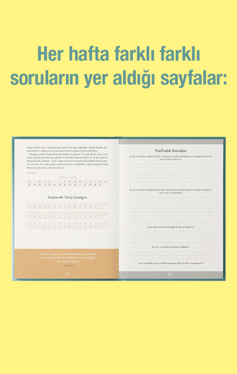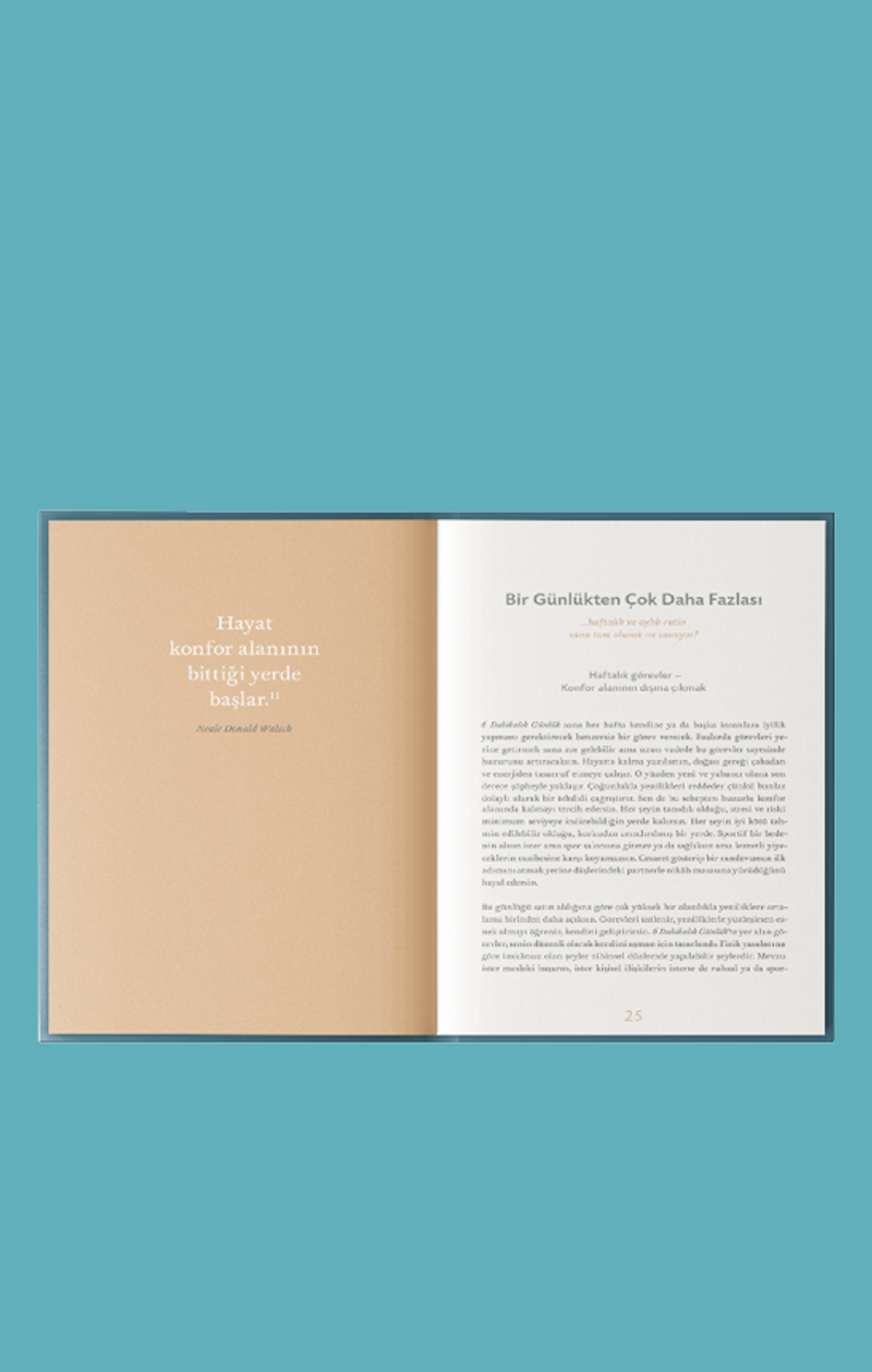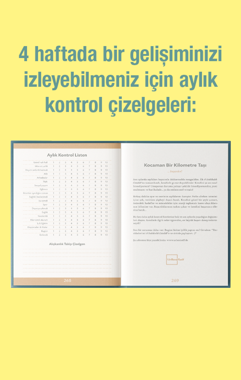 BİR GÜNLÜKTEN ÇOK DAHA FAZLASI: Giriş kısmında stratejilerin somut uygulamalarını, teşvik edici anekdotları ve günlükten maksimum seviyede yararlanabilmen için gereken ipuçlarını bulacaksın. Ardından günlere, haftalara ve aylara göre bölümlenmiş günlük kısmı geliyor. Son olarak ise sana neyin daha iyi geldiğini takip edip onu hayatına daha çok uygulamanı sağlayacak not kısmı karşına çıkacak.