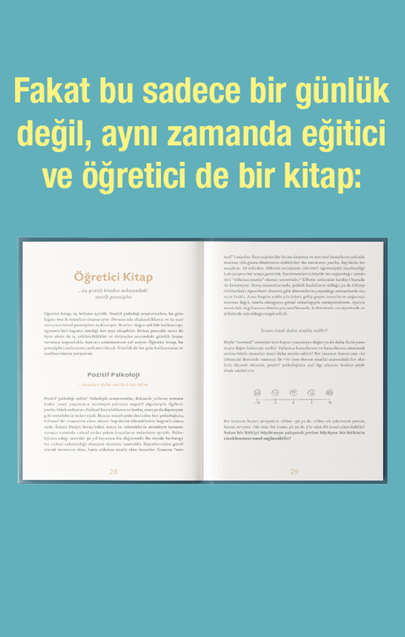 DAHA MUTLU VE TATMİN EDİCİ BİR HAYAT İÇİN BASİT VE BİLİMSEL BİR YAKLAŞIM: Bu günlük, pozitif psikoloji ve nörobilimdeki araştırmaların sonuçlarına dayanarak hazırlandı. 20 dile çevrildi ve tüm dünyadan 1.500.000’i aşkın kullanıcıya ulaştı. Sen de onu kullanarak hayatını daha bilinçli yaşa ve her günün daha pozitif geçsin!