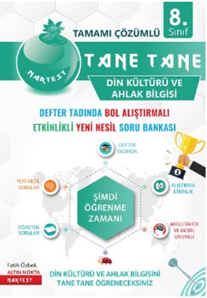 Değerli meslektaşlarımız, sevgili öğrenciler; Tane Tane Öreniyorum Kitabımız, Din Kültürü ve Ahlak Bilgisi dersini elenerek örenebilmeniz için Milli Eğitim Bakanlığı’nın 8. Sınıf Din Kültürü ve Ahlak Bilgisi dersi program ve kazanımlarına uygun olarak hazırlanmıştır. Bu çerçevede kitabımızda; kazanımlara paralel konu özetleri, örnek sorular, konu etkinlikleri, bulmacalar, konu testleri, ünite testleri ve ünite sonlarında yeni nesil sorular bulunmaktadır. Kitabımız MEB tarafından yayımlanan örnek sorulara ve Liseye Geçi Sınavı’na uygun olarak hazırlanmıştır. Tane Tane Öreniyorum adın verdiğimiz kitabımızda öğrencilerimizin okuduğunu anlaması, yorum yapabilme becerilerinin ve analiz, sentez muhakeme yeteneklerinin gelişmesi amaçlanmaktadır. Yeni sınav sistemi ezberci anlayıştan uzak, bilginin doru yorumlanması mantığına dayandığı için kitabımızda yorum sorularına bolca yer vermiş bulunmaktayız. Kitabımızda aşağıdaki gibi bir işleyiş teması ile kazanımların öretilmesi ve değerlendirilmesi amaçlanmıştır. Öğreten Sorular Bölümü: Kazanımlar içeren özet bilgiler verildikten sonra bu bilgileri pekiştirici etkinliklere ve sorulara yer verilmiştir. Tane Tane Ören Bölümü: MEB tarafından yayımlanan kazanımların öğrencilerimizde kalcı hale getirilmesi amacıyla hazırlanmıştır. Bu bölümde öğretmenlerimiz tarafından öğrencilerimize ödev olarak kullanabilecekleri testlere yer verilmiştir. Ünite Değerlendirme Testi Bölümü: Üniteye bal olan bütün konular kapsayacak şekilde hazırlanmış olan bu bölüm ile ünitenin tamamının değerlendirilmesi amaçlanmıştır. Öğretmenlerimiz bu bölümdeki testlerin sonuçlarına bakarak öğrencinin konuyu örenme düzeyini belirleyebilir ve gereken konulara gereken müdahaleyi zamanında yapabilir. Yeni Nesil Testler Bölümü: Sözel mantın, muhakemenin ve bilgiyi yorumlamanın ön plana çıktı bu bölüm, MEB tarafından yayımlanan örnek sorular ve iki yıldır yapılan Liseye Geçi Sınav’ında sorulan sorular örnek alınarak hazırlanmıştır. Sevgili öğrencilerimiz; sınavda başarılı olmak planlı ve verimli çalma ile mümkündür. Sınava hazırlanırken kullanacağınız kaynakların sizin başarınızda önemli yeri varıdır. Sınava hazırlanırken almış olduğunuz bu kitap Din Kültürü ve Ahlak Bilgisi dersi açsından hedefinize ulaşmanız sağlayacaktır. Çok titiz bir çalışmanın ürünü olan kitabımızın tüm meslektaşlarımıza ve öğrencilerimize faydalı olmasın temenni ederim.