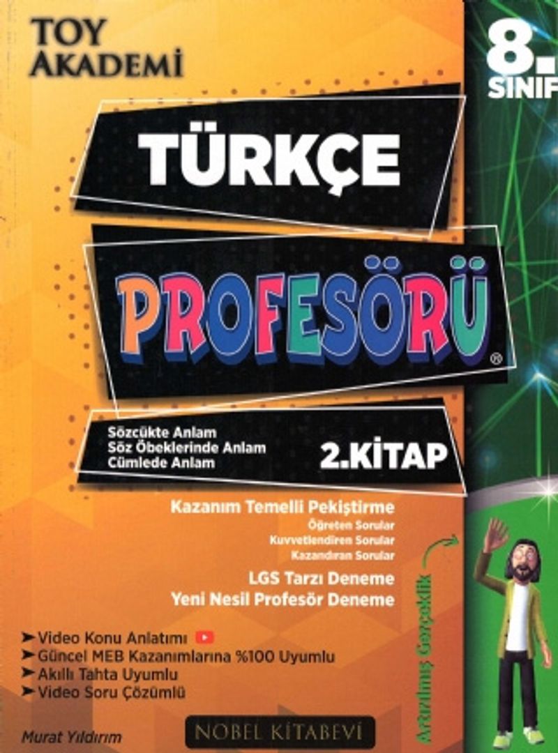 TOY Akademi Türkçe Profesörü 2. Kitap Sözcükte Anlam-Söz Öbeklerinde Anlam-Cümlede Anlam konularını detaylı bir şekilde anlatmaktadır. 3 dilbigisi konusunu 1 kitaba sığdıran Türkçe Profesörü, 8. Sınıf ve LGS hazırlığında en önemli yardımcı kitaplardan biri olmaya aday. Kitap her kazanım için Öğreten Sorular, Kuvvetlendiren Sorular ve Kazandıran sorular olarak 3 bölümde anlatılmaktadır. Her kazanımın başında konu özetli anlatım ile kazanımın en iyi şekilde öğrenilmesi sağlanmaktadır. Tamamı video çözümlü sorular sayesinde öğrenciler anlamadıkları soruları izleyebilecek, konu özetlerini okurken de Video Konu Anlatımını karekod ile okuttuktan sonra uzman öğretmen eşliğinde seyredebilecektir. MEB Kazanım sıralamalı olarak hazırlanan kitap, öğrencinin hem birçok soru tipini bir arada gördüğü, hem de Yenilenen Müfredata uygun beceri temelli ve Yeni Nesil, sözel mantık soru kalıplarına uyum sağlamasına yardımcı olur.