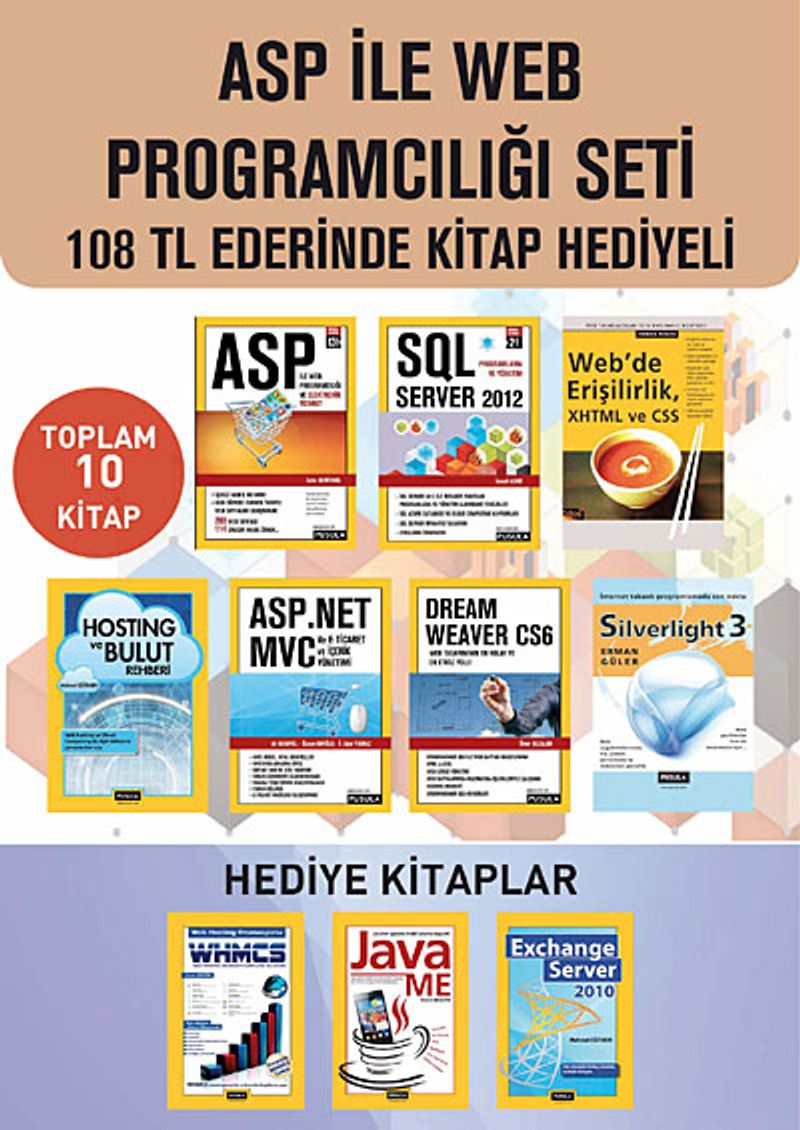 Web programcılığının en çok kullanılan aracı ASP ve ASP.NET MVC ile e-ticaret ve içerik yönetiminin ayrıntılarıyla ele alındığı bu set, ayrıca SQL Server 2012, Hosting ve Bulut Rehberi, Webde Erişilirlir gibi konuları ve SilverLight ile Dreamwevar gibi uygulamaları da içeriyor.