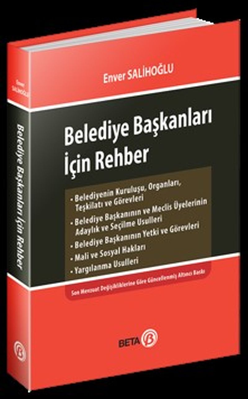 A- Belediye Hakkında Genel Bilgiler *I. Tarihçe *II. Belediyenin Tanımı *III. Belediyenin Organları *IV. Belediyenin Denetimi *V. Belediyenin Görevleri *VI. 5216, 5393 ve Diğer Kanun ve K.H.K'lerle Getirilen Önemli Yenilikler B- Belediye Başkanının Görev ve Yetkileri *I. 5393 Sayılı Kanunla Verilen Görevler *II. 5216 Sayılı Kanun'la Belediye Başkanına Verilen Görevler *III. Diğer Mevzuatla Belediye Başkanına Verilen Görev ve Yetkiler *IV. Belediye Başkanının Katılacağı Kurullar *V. Belediye Başkanının Yetki Devri C- Belediye Başkanı ile İlgili İnceleme ve Soruşturma Yapılması *I. Belediye Başkanının Görevleriyle İlgili Olarak İşlediği İleri Sürülen Suçların İncelenmesi ve Soruşturulması *II. Belediye Başkanının Görevleri ile İlgili Bazı Suçlar *III. Görevle İlgili Olmasına Rağmen İzne Tabi Olmadan Soruşturulan Suçlar *IV. Görevle ilgisi Olmayan Suçlar *V. Görevden Uzaklaştırma *VI. Belediye başkanının Görevine Son Verilmesi *VII. Belediye Başkanlığının Sona Ermesi *VIII. Blediye Başkanlığının Boşalması Üzerine Yapılacak İşlem D- Belediye Başkanlığının Hakları *I. Mali Haklar *II. Diğer Haklar E- Belediye Başkanının Yapamayacağı İşler ve Görevler *I. 5393 Sayılı Kanuna Göre *II. 5216 Sayılı Kanuna Göre *III. Diğer Mevzuata Göre F. Belediyelerin Yararlanabileceği Merkezi İdare Yardımları ve Fonları *I. Kalkınma Bakanlığınca Yapılan Yardımlar *II. Çevre ve Şehircilik Bakanlığınca Yapılan Yardımlar *III. Kültür ve Turizm Bakanlığınca Yapılan Yardımlar *IV. Maliye Bakanlığı Bütçesine Konulan Mahalli İdarelere Yardım Ödeneği *V. Muhtaç Asker Ailelerine Yardım *VI. Avrupa Birliği Fonlarının Yapılan Yardımlar *VII. İçişleri Bakanlığınca Yapılan Yardımlar *IX. Başbakanlık Acil Destek Programından Yapılan Yardımlar *X. Toplu Konut İdaresince Yapılan Yardımlar