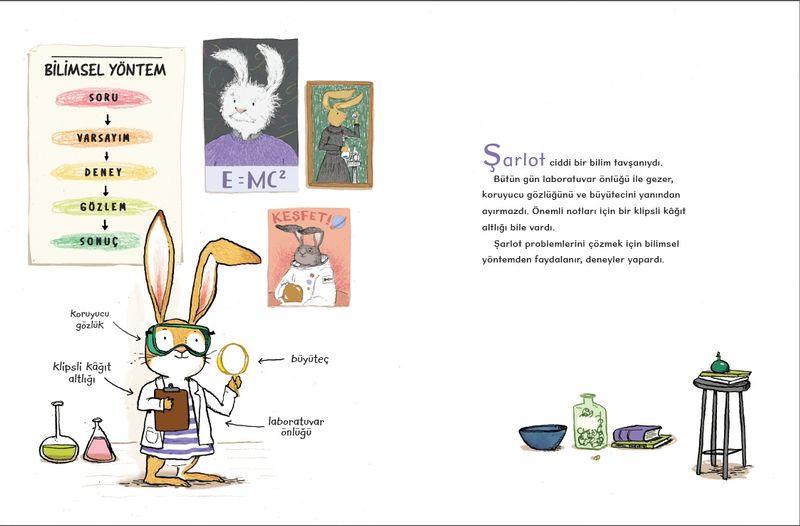 Bilim Tavşanı Şarlot’la çocuklar bilimsel yöntemin 5 temel adımını basitleştirilmiş haliyle öğrenip, problem çözme becerilerini geliştirebilecekler. Kitap, derste ya da evde kolaylıkla uygulanabilecek etkinlik sayfaları da  içeriyor.