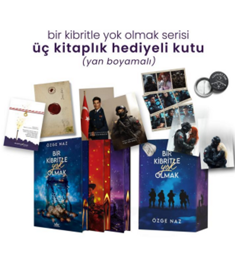 Bir Kibritle Yok Olmak 1 (Yan Boyamalı) Bir Kibritle Yok Olmak 2 (Yan Boyamalı) Bir Kibritle Yok Olmak 3 (Yan Boyamalı) Şeffaf Ayraç (2 Adet) Özel Tasarım Defter Karakter Kartları (4 Adet) Bileklik (2 Adet) Rozet Uyarı: Yetişkin okurlar içindir
