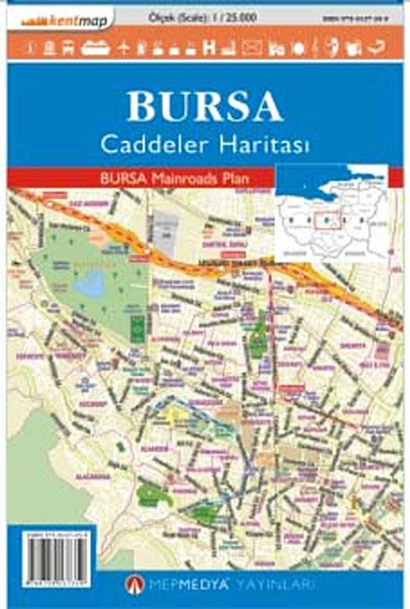 Tamamı renkli, ithal kuşe kağıt Sınırlarıyla ilçe ve mahalleleri ile 1 / 7,500 ölçekte Bursa nın merkezinin cadde detaylı planı. Otoyol, hızlı yol, bulvar ve caddeler ile kavşakları En güncel cadde detaylı geniş bir kent alanı Yol takibi için uygun tasarlanmış, alfabetik indeks kitapçıklı.