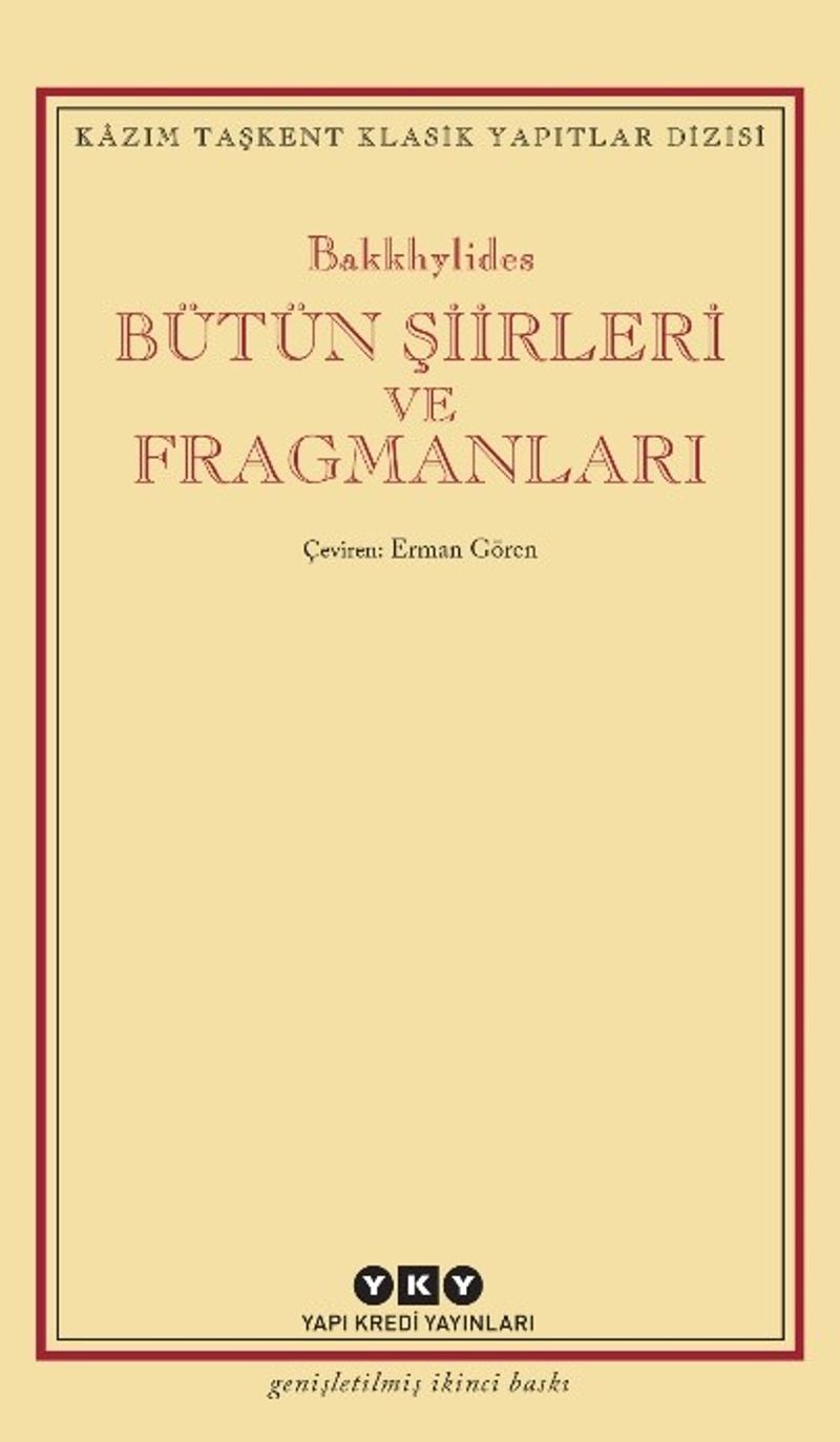“Bakkhylides” İskenderiye Kütüphanesi’nin âlimleri tarafından antik Yunan lirik şiirinin dokuz büyük isminden biri kabul edilmiştir. Bu dokuz büyük şairin arasında yer alan Simonides’in yeğeni, Pindaros’unsa çağdaşıdır. “Epinikion” (atletik müsabakaların galiplerini övmek amacıyla yazılan “zafer şarkıları”) yazımındaki rakibi ve çağının en ünlü şairi Pindaros’un gösterişli üslubunun aksine, Bakkhylides’in şiirlerinin ayırt edici özelliği dilinin sadeliği ve akıcılığıdır. Elinizdeki kitap, Bakkhylides’in bütün “epinikion”larının ve “dithyrambos”larının (bağbozumu şenliklerinde okunan Dionysos ilahileri) yanı sıra diğer türlerdeki şiirlerini ve fragmanlarını bir araya getiriyor.