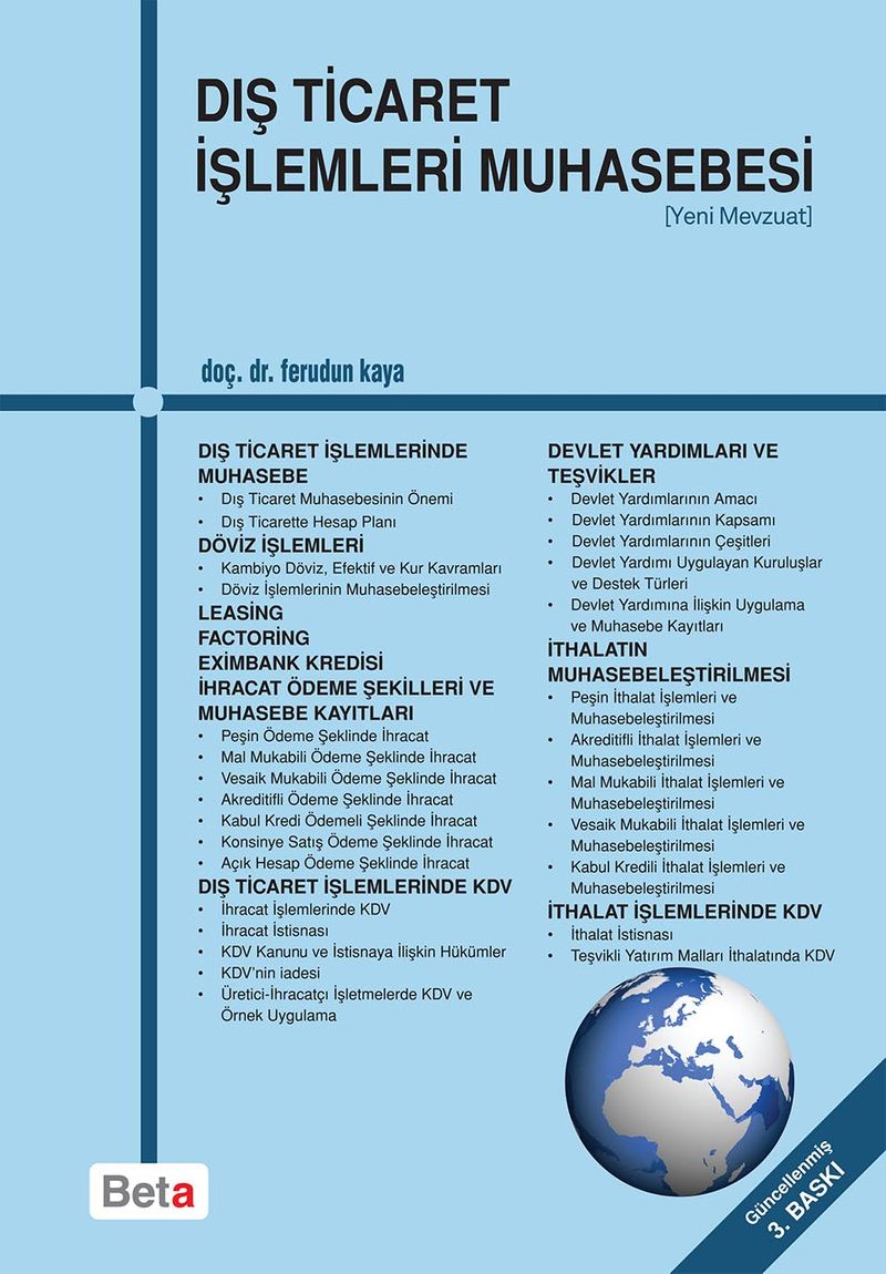 *Dış Ticaret İşlemleri Muhasebesi *Döviz İşlemleri *Leasing, Factoring, Eximbank Kredisi İhracat Ödeme Şekilleri ve Muhasebe Kayıtları *Dış Ticaret İşlemlerinde KDV *Devlet Yardımları ve Teşvikleri *İthalatın Muhasebeleştirilmesi *İthalat İşlemlerinde KDV