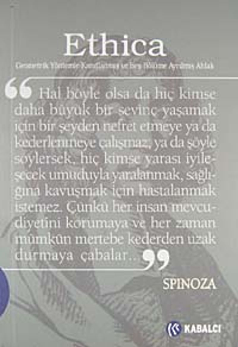 Türkçeye ilk kez Latince özgün metinden çevrilen Batı Felsefesi’nin sarsılmaz klasiği Spinoza’nın Ethica’sı, ele aldığı “Tanrı, İnsan, Zihin, Beden, Akıl, Duygular, Özgürlük” gibi derin felsefi konulara matematiksel bir düşünme yöntemiyle ve mantık kuralları çerçevesinde yanıt arayan, özgün bir üslupla kaleme alınmış, zorlu, çarpıcı ve kışkırtıcı bir eserdir. Tanımlarla, açıklamalarla, önermelerle, önerme sonuçlarıyla, kanıtlamalarla ve notlarla örülü içeriği, insanın bu eseri çoğu felsefe kitabından ayrı bir rafa yerleştirmesini, zihninin en açık ve en berrak anında o raftan alıp okumaya başlamasını, hatta bütün kitabı bitirdikten sonra tekrar başa dönüp bu kez daha ayrıntılı bir bakış açısıyla okumasını gerektirir. Bu yüzden belki de ancak Spinoza’yla karşılıklı oturup konuşarak, tartışarak, dura dura, sindire sindire okununca kavranabilecektir. O vakit görülecektir ki, aslında Ethica’nın o yoğun mantık örgüsü içine gizlediği tek bir hedefi vardır: insan aklını varlığın en üst bilgisine erişecek kıvama getirmek ve bu şekilde insana sonsuz bir mutluluk yaşatmak...