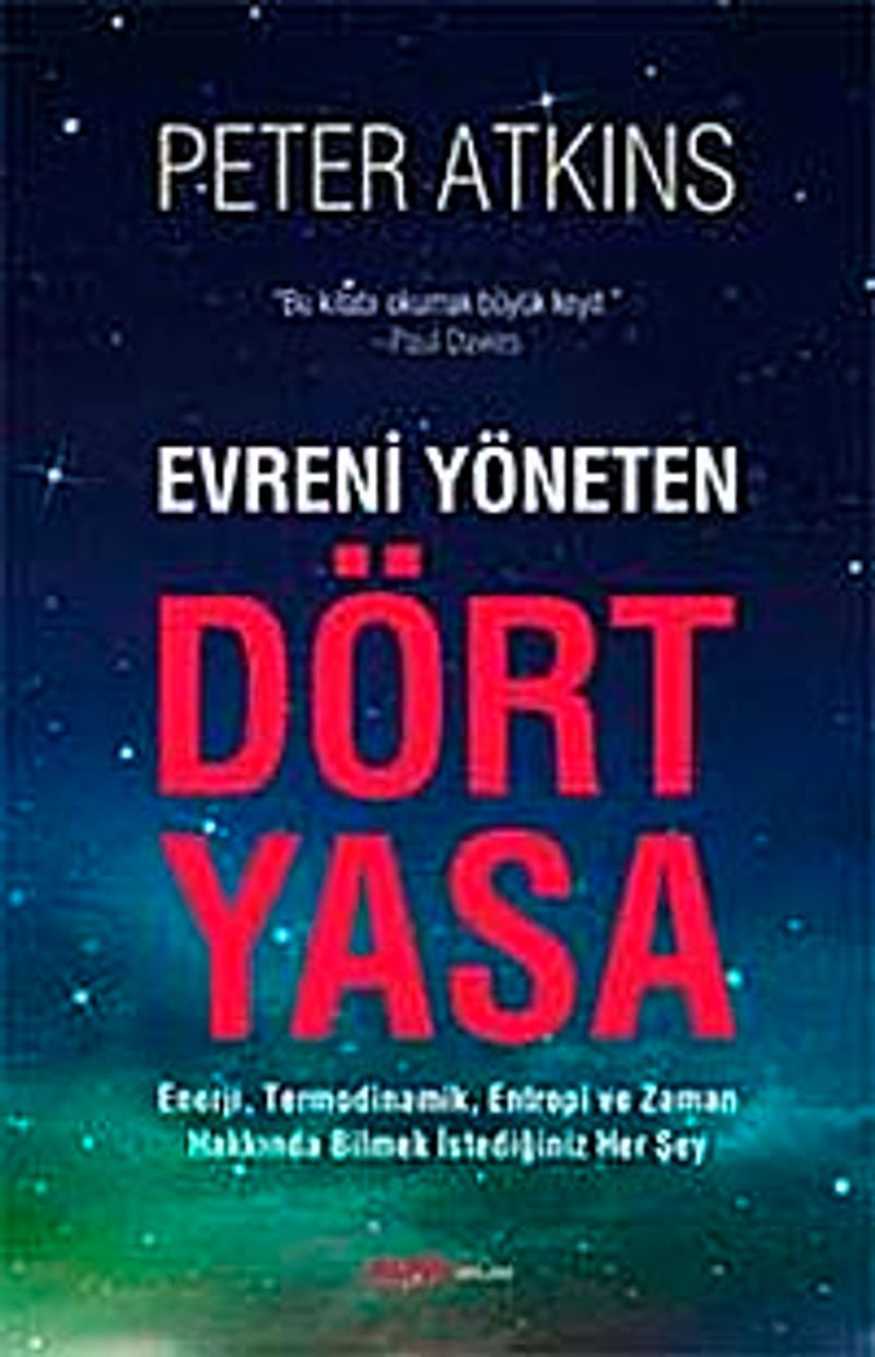 Evreni tanımlayan yüzlerce yasa içinde, az miktarda güçlü yasa gizlenmiş olarak bulunur. Bunlar enerjinin özelliklerini ve dönüşümünü özetleyen termodinamiğin yasalarıdır. Kavramlar on dokuzuncu yüzyılda ortaya çıkmış olsa da, termodinamiğin yasaları formüle edilip, sonuçları keşfedildikçe, kimyadan yola çıkıp yaşam süreçlerine varana kadar, oldukça geniş olay aralığına dokunabileceği görülmüştür. Evreni Yöneten Dört Yasa’dan ilk ikisi bilinen, ancak yine de esrarengiz olan iki özelliği, sıcaklığı ve enerjiyi anlatır. Üçüncüsüyse çoğu kişinin anlaşılmasını çok daha zor bulduğu bir özelliği, entropiyi anlatır. Sonuncu yasa daha tekniktir, fakat konuyu daha anlaşılır kılar.