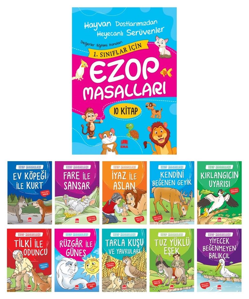 Ezop Masalları Seti 1 ve 2. Sınıflar için Düz Yazılı (10 Kitap Takım, Büyük Boy)