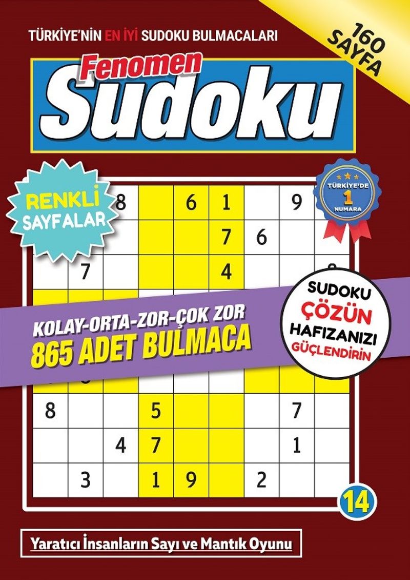 Sizlere yepyeni ve farklı bir kitap hazırladık. Tüm seviyelerde 1.200 adet Sudoku çeşidini Fenomen Sudoku’da topladık. Fenomen Sudokuyu uzun süre elinizden düşürmeyecek, yeteneğinizi geliştirecek, beyin egzersiziyle, hafızanızı güçlendireceksiniz. Takıldığınız bir bulmaca üzerinde fazla durmayın. Kitabın sonunda bulunan çözümlere bakarak cevaplarınızı kontrol edebilirsiniz.
