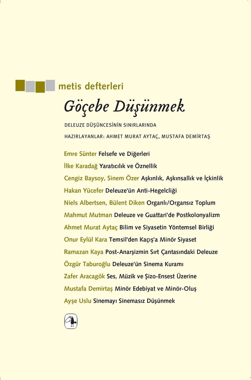 Son yıllarda Gilles Deleuze'ün gerek kendi başına gerekse Felix Guattari ile birlikte yazdığı önemli eserlerin çoğu Türkçede yayımlandı. Ancak Deleuze düşüncesi üzerine Türkçe yazılmış incelemeler için aynı şeyi söylemek mümkün değil. Göçebe Düşünmek bu eksikliği doldurma yolunda atılmış önemli bir adım. On beş akademisyen, aktivist ve düşünür Deleuze'ü ve geliştirdiği "göçebe düşünce" tarzını felsefe, siyaset ve sanat alanındaki çeşitli sorunlar üzerinden serimliyor, bu düşünme tarzının birer uygulamasını sunuyorlar. Tam da Deleuze'ün isteyeceği üzere, onun düşüncesini yorumlamakla kalmayıp "kullanan", yeniden düşünerek geliştiren metinler.