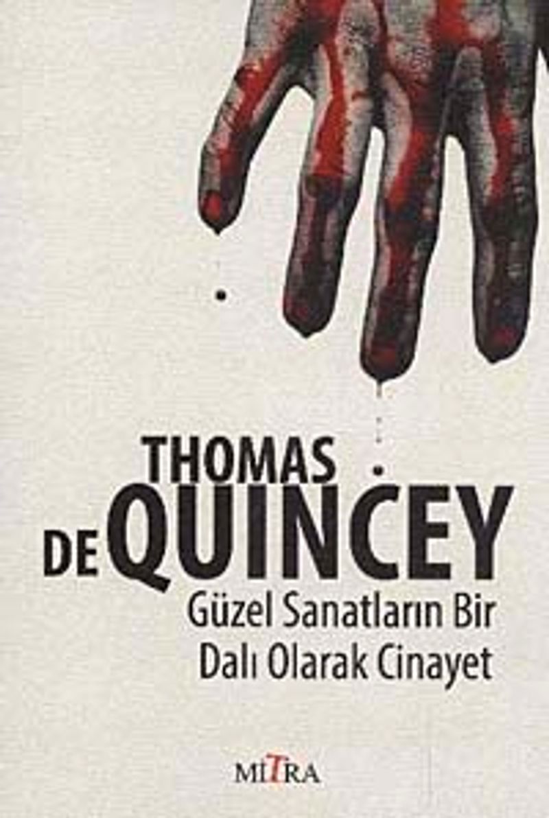 Bir cinayete canavarca gerçekleştirilmiş bir eylem değil de, titizlikle tasarlanmış bir sanat eseri, katile ise bir sanat üstadı olarak bakılabilir mi? Üç bölümden oluşan Güzel Sanatların Bir Dalı Olarak Cinayet isimli denemesinde Thomas De Ouincey, ahlâkçılıktan sıyrılarak, 'cinayeti' her ayrıntısı ince ince düşünülmüş bir sanat eseri olarak değerlendiriyor. Bunu yaparken de, aynı zamanda şiddetle sanatsallığı harmanlayarak allak bullak ettiği okuyucuyu kendisine insani sorular sormaya itiyor. Polisiye edebiyatın en çarpıcı örneklerinden biri olan bu sürükleyici eser sadece aykırı bakış açısıyla değil, aynı zamanda şiirsel diliyle de dikkat çekiyor.