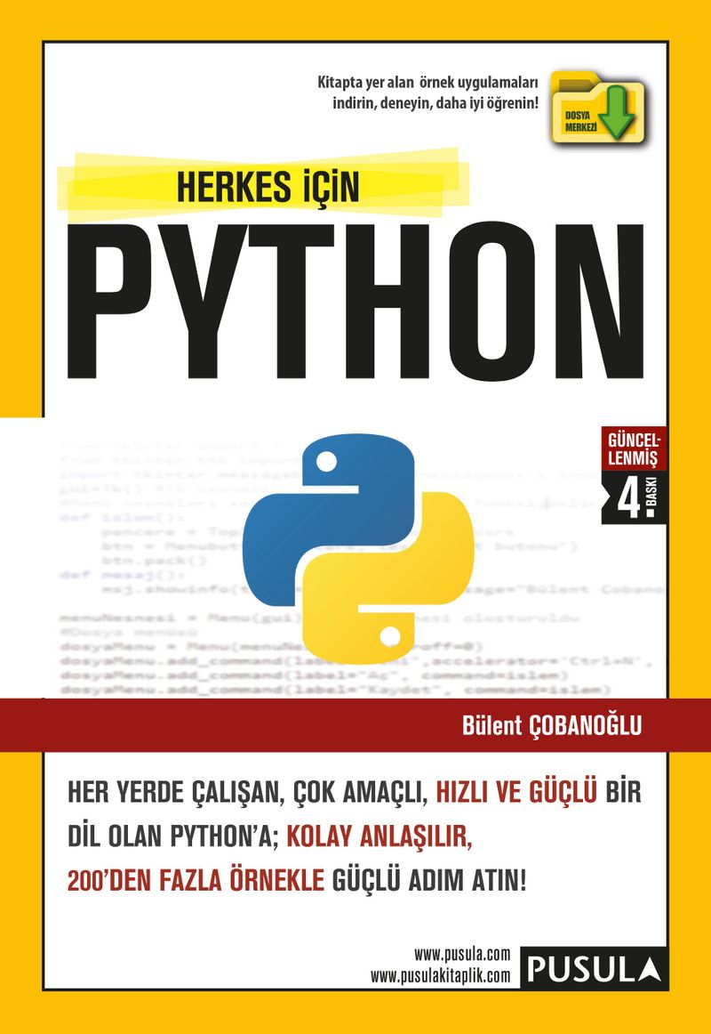 Kitapla birlikte, her bölümde anlatılan konularla ilgili daha fazla örnek içeren kodlar www.pusulakitaplik.com web sitesindeki “Dosya Merkezi”nde kullanıcılara sunuluyor. Tüm uygulamalar, hem Python 3.6.5 hem de Python 3.7.0 sürümü ile test edilip çalıştırılmıştır.