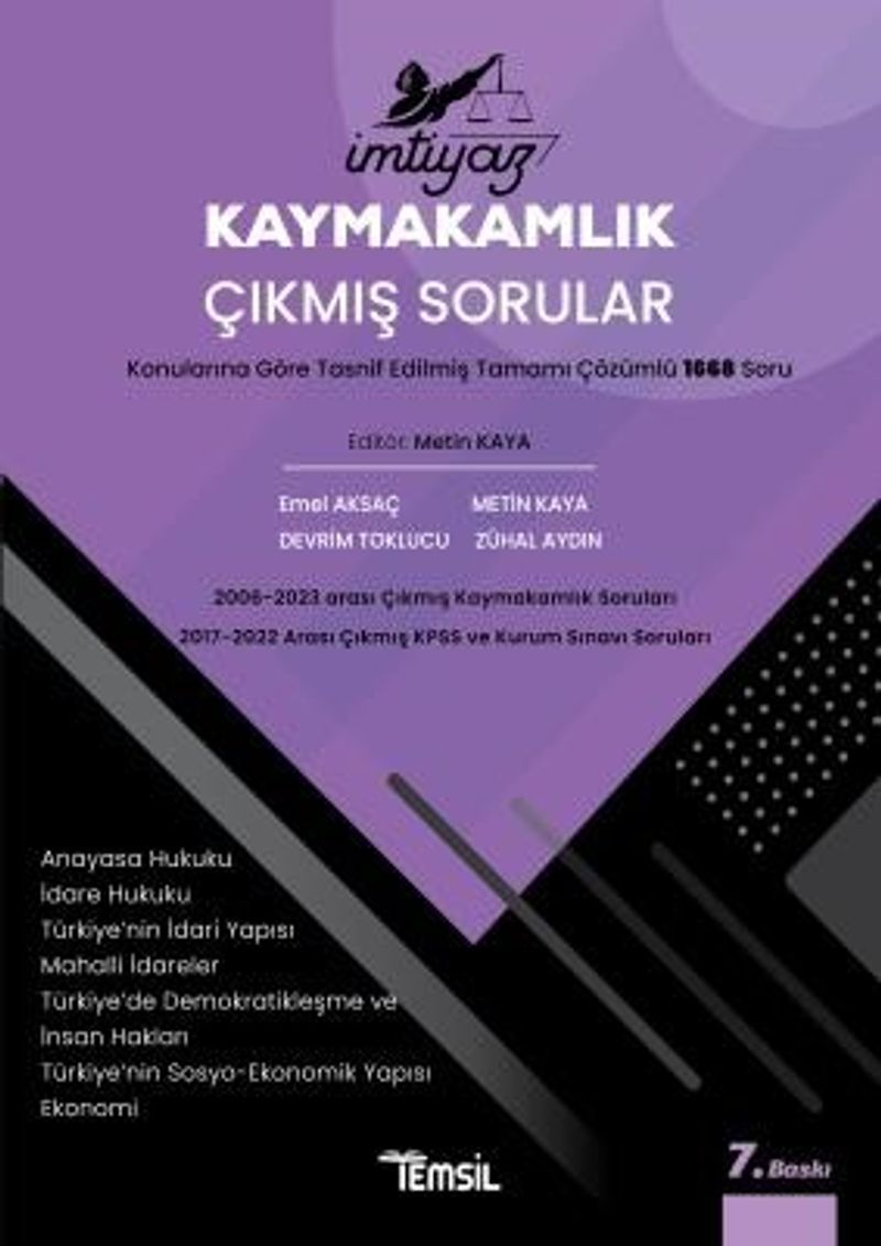 Kitap Kaymakamlık, Hakimlik ve KPSS sınavlarında çıkan sınav sorularından oluşmaktadır. Kaymakamlık sınavının son 10 yıllık soruları ile Hakimlik sınav soruları orijinal kaymakamlık sınavının 2018 öncesi soruları ise uyarlama olarak hazırlandı. Kitabın içinde yer alan sorular her derste konularına göre tasnif edilerek yazıldı ve birden fazla sınavda çıkmış sorularda tekrara düşmemek adına sorunun çıktığı yıllar tek bir başlık altında toplandı. Soru çözümlerini sadece ilgili sorunun içeriği ile sınırlı tutmadık. Öğrenciler soruyu çözdüğünde bir daha konu anlatımına gerek kalmaksızın o konun bütün detaylarını çözüm bölümünde görebilecektir. Çözümleri geniş tutmaktaki amacımız tek bir kaynak ile bütün detayların toplu bir şekilde görülmesini sağlamaktır.