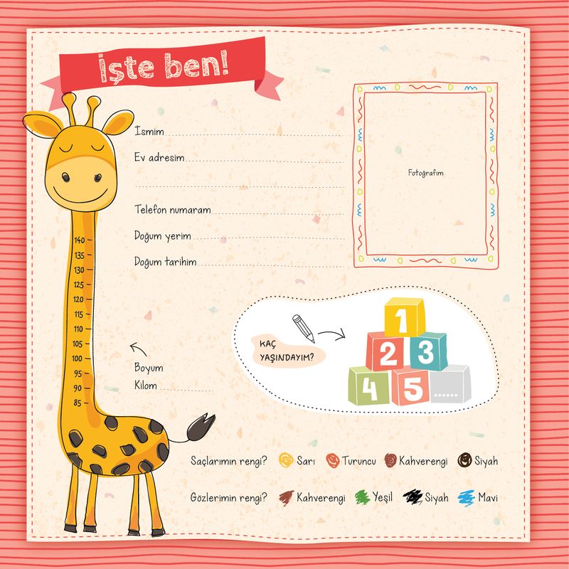 Albümü çocuğunuzla beraber doldurup kişiselleştirebilir, sevdiği renkler, hayvanlar, yiyecekler, bildiği sayılar gibi bölümleri boyayıp işaretleyebilirsiniz.