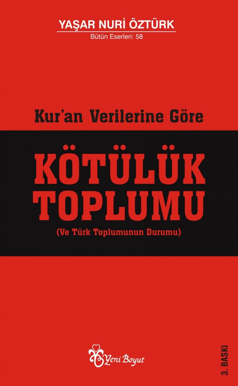 Türk toplumu bir kötülük toplumu. Türk toplumu büyük çoğunluğu ile aklın değil, aldanmanın, ilmin değil, cehaletin, Kur'an'ın değil, hurafenin, ciddiyetin değil, laçkalık ve ucuzculuğun yanında yer almaktadır. Kısacası, Türk toplumu bir 'mefsedet toplumu' manzarası arz etmektedir. Mefsedet varsa bunun miktarı, sayısı önemli değildir. Varlık yasaları ve Kur'an, hükmünü mefsedete göre vermektedir.