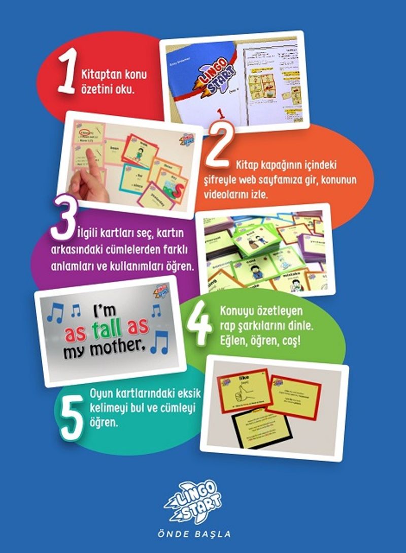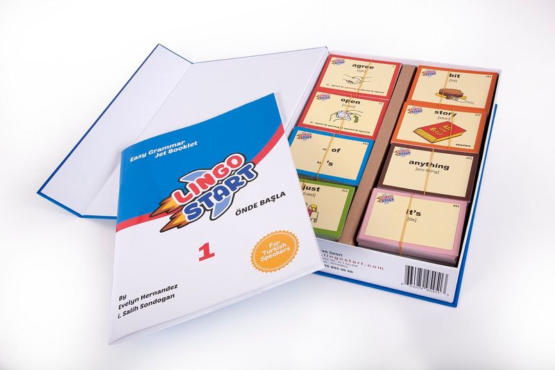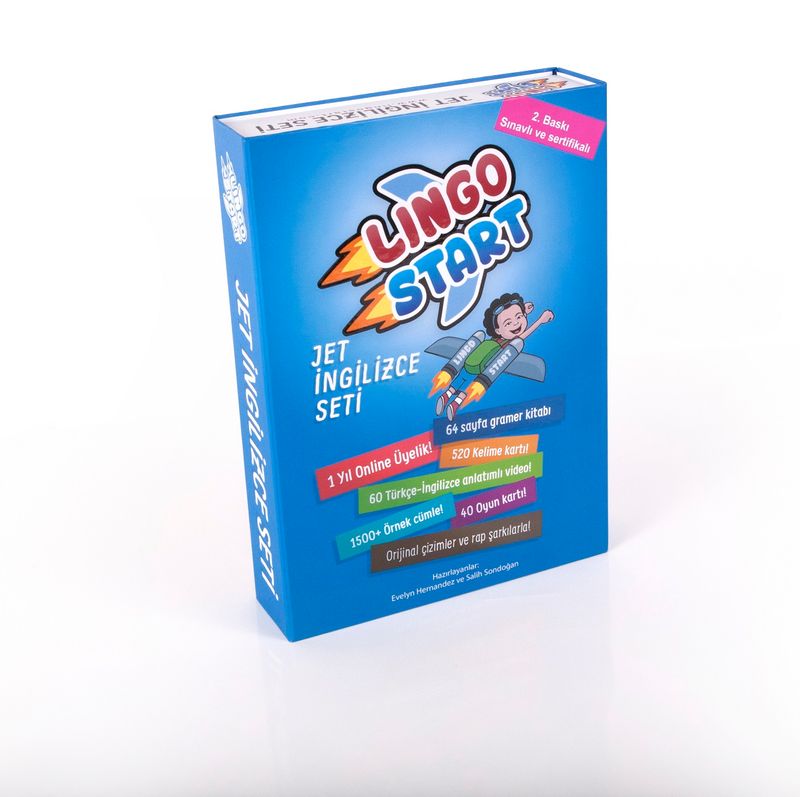 Lingo Start Jet İngilizce seti ve Kelime Kartları A1 başlangıç seviyesinden B2 seviyesine uzanan konuların işlendiği çok Özel bir Settir. İngilizce setimiz hem basılı hem de Online içeriğe sahiptir. Online Ders Anlatımlara ve Sınavlarımıza setin içerisindeki kitabımızın iç kapağındaki şifreyi web sayfamıza girerek ulaşacaksınız. Setin içerisindeki kelime kartları fonksiyonel olup renk kodlamasıyla, kelimelerin türü de (isim fiil sıfat vb.) belirtilmiştir. Kitabımızdaki konu anlatımlarımız ise elinizdeki fonksiyonel kartlarla, İngilizce cümle kurulumlarını sizler için eğlenceli bir hale getirecek. Kelime bilginizi Oyun Kartlarımızla Sınayabileceksiniz. Gelişiminizi Platformumuz üzerinden Takip edebilecek tüm ders videolarını ve sınavlarınızı tamamlayınca Lingo Start Sertifikanızı alacaksınız!