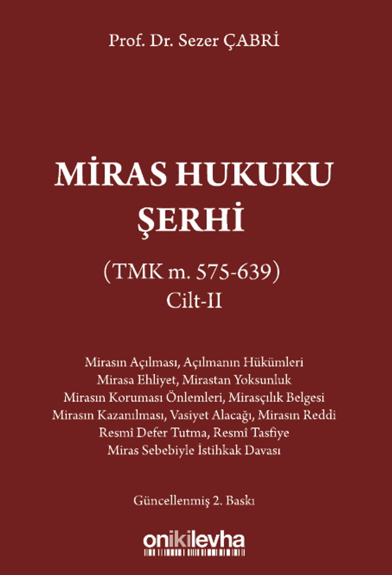 Miras Hukuku Şerhi adlı eserimiz üç ciltten oluşan ve Türk Medeni Kanunu'nun Miras Hukuku'na ilişkin hükümlerin tamamının incelenmesini amaçlayan bir çalışmadır. "Miras Hukuku Şerhi Cilt-II" adlı bu eserde TMK m. 575-639 hükümleri kapsamında mirasın açılması, mirasa ehliyet, mirastan yoksunluk, gaibin mirası, terekenin korunması önlemleri (defter tutma, mühürleme, terekenin resmen yönetilmesi), vasiyetnamenin açılması, mirasçılık belgesi, mirasın kazanılması, vasiyet alacağı, mirasın reddi, terekenin resmi defterinin tutulması, resmi tasfiye ile miras sebebiyle istihkak davası konuları Türk-İsviçre Hukuku öğretisi doğrultusunda ayrıntılı olarak incelenmiştir. Eser kapsamındaki konularla ilgili ulaşılabilen bütün yargı kararları taranmış ve özellik arz eden çok sayıda karara yer verilmiştir.