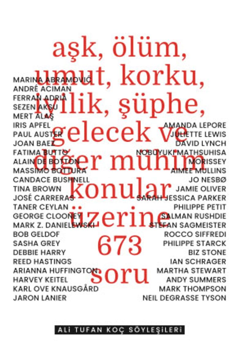 Ali Tufan Koç’un “Söyleşiler Kitabı”nda Philippe Petit ‘cesareti ve korkuların üzerine yürüyebilmeyi’; George Clooney ‘pişmanlıklara farklı bir gözlükle bakabilmeyi’; Salman Rushdie ‘evin aslında ne demek olduğunu’; Marina Abramović ‘gözü karalığı’; Karl Ove Knausgård ‘kendine dürüst olabilmeyi’; Stefan Sagmeister ‘çıplaklığın doğasını’ anlatıyor.