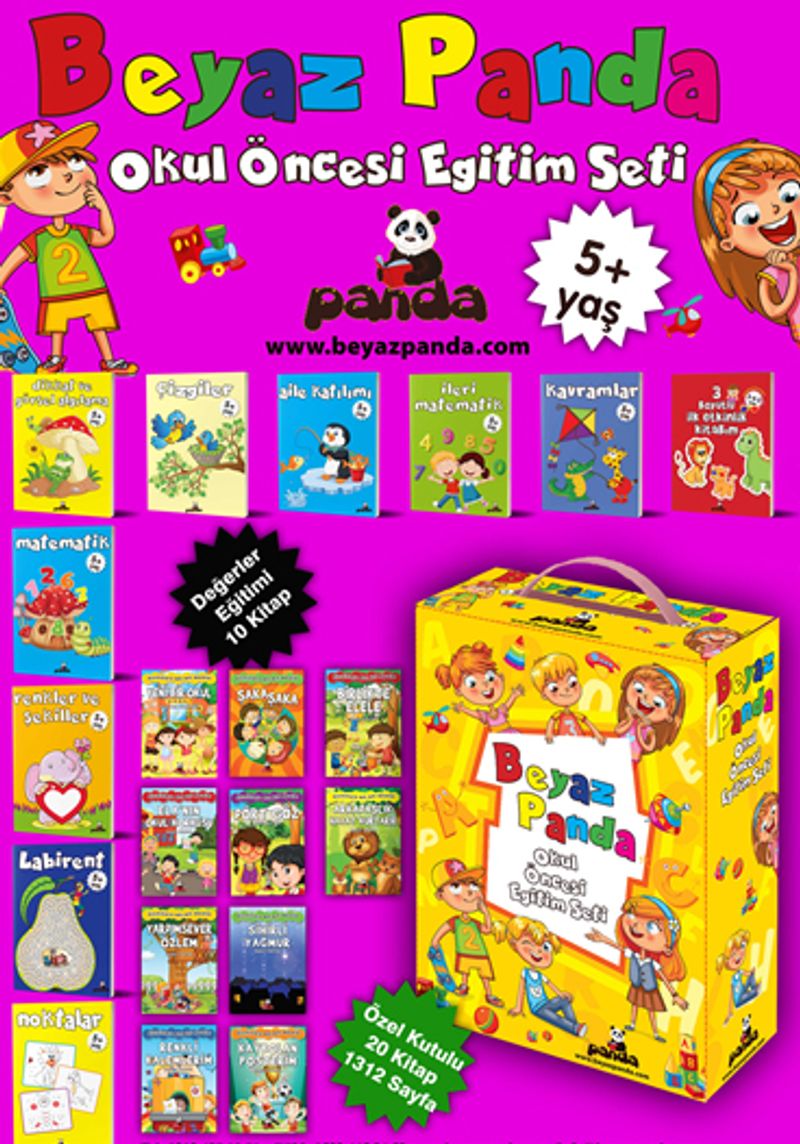 Beyaz Panda Okul Öncesi Eğitim Seti 0-6 yaş dönemindeki çocuklara olumlu çevresel uyaran olması amacıyla hazırlanmıştır. Bu sette sunulan kitaplardaki çalışmalar çocuk merkezlidir. Okul öncesi eğitimin ayrılmaz bir parçası olduğu gerçeği ile tüm etkinlikler oyun temelli olarak hazırlanmıştır. Çocukların bilişsel, dil, sosyal-duygusal, ince ve kaba motor gelişimlerini destekleyecek ve geliştirecek etkinliklere sıklıkla yer verilmiştir