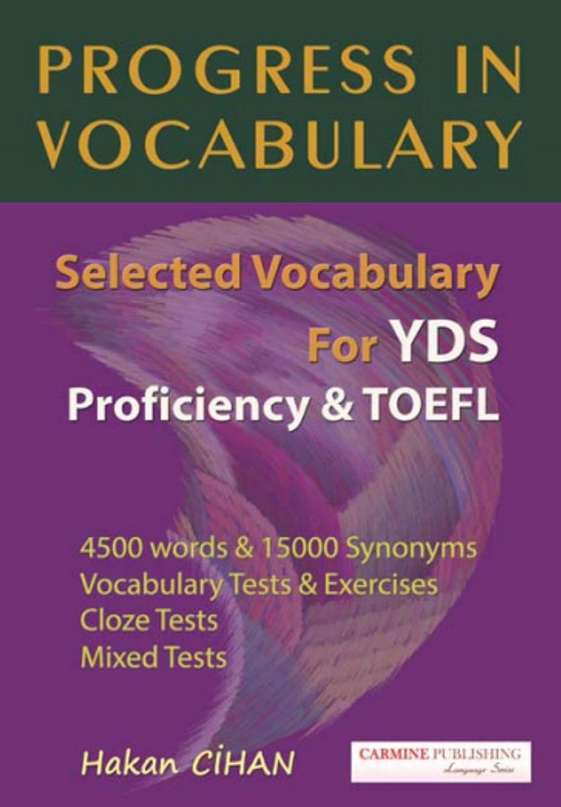 Progress in Vocabulary İngilizce öğrenimi ve YabancıDil Sınavlarıiçin yaşamsal olan sözcük bilginizi geliştirecek bir kaynak kitaptır. Bu kitap, belirli amaçlar göz önünde bulundurularak, çok uzun ve titiz bir çalışmanın sonunda, bu amaçlar çerçevesinde gerekli olanlarından derlenerek hazırlanmış sözlük ve edinilen bilgiyi sınayacağınız “General Vocabulary Tests”, “Cloze Tests” başlıklarıaltında her kelime türü için ve karışık olarak hazırlanmışçok sayıda özgün test ve bunların cevap anahtarlarından oluşmaktadır. Kitabın sözlük bölümü, değişik sözcük kümelerine göre sınıflandırılmış, her sözcük kümesi A’dan Z’ye kadar bir veya birden fazla harf başlıklarıaltında ayrıayrıverilmiştir. Sözlük bölümü, belirli bir düzeyin üzeri için temel sayılan ve özellikle YabancıDil Sınavlarıiçin gerekli olan sözcüklerden oluşmaktadır. Kelime öğrenimi ve YabancıDil Sınavlarına yönelik hazırlanan sözcükler için, son yıllarda bu sınavlarda soru olarak çıkan, metinlerde yer alan ve ileride de çıkma olasılığıolan sözcüklerden bir derleme yapılmıştır. Progress in Vocabulary, İngilizcede okuma, okuduğunu anlama, yazma, çeviri gibi sözcük bilgisinin ve sözcüklerin doğru ve bağlama uygun anlamlarının bilinmesi-kullanılmasıgereken yerlerde yararlıbir başvuru kaynağıdır. Progress in Vocabulary’nın, sözlük bölümünde 4500’nin üzerinde sözcük, yaklaşık 15000 İngilizce yakın anlamlısözcük, 6000 örnek cümle ve ayrıntılıilgeçler (prepositions) bölümü yer almaktadır. Kitapta öğrendiğiniz sözcükleri sınayacağınız, değişik soru teknikleri ile hazırlanmışçok sayıda özgün soru içeren testler bulunmaktadır. İngilizcede sözcük dağarcığınızıgeliştirirken yararlanacağınız Progress in Vocabulary kitabıbu alandaki başarınızıarttıracağına inanılarak hazırlanmıştır.