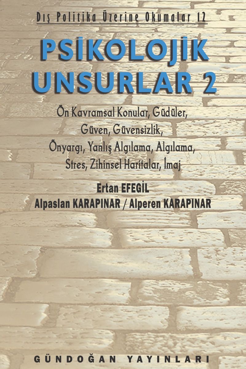 Elinizdeki bu kitapta, genel olarak psikolojik unsurlar, güdüler, güven, güvensizlik, geriye dönük önyargı, önyargılar, yanlış algı, algı, imgeler, travmatik stres, zihinsel haritalar ve imaj üzerine çalışan akademisyenlerin görüşleri, detaylı bir şekilde özetlenmeye çalışılmıştır.