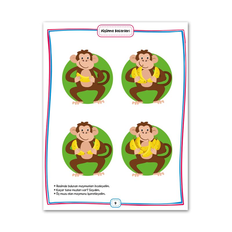 Zihinsel kapasitenin arttırılmasın sürecinde algı, dikkat, farkındalık ve öğrenmeye yönelik zihin aktiviteleri önemli bir rol taşımaktadır. Kitabımızda, 36. ayın sonuna kadar kazanılması gereken beceri ve kazanımlara yönelik olarak görsel dikkat, görsel algı, işitsel dikkat, görsel muhakeme, el-göz koordinasyon, düşünme becerileri, görsel ayrımlaştırma, eşleştirme, kavramsal beceriler, sıralama, bütünsel algı, parça bütün ilişkisi ve analitik düşünmeye yönelik bilişsel etkinlik örnekleri yer almaktadır. Tüm gelişim alanlarında olduğu gibi farklı materyaller ve kaynaklar kullanmak bu süreci zenginleştirmektedir.